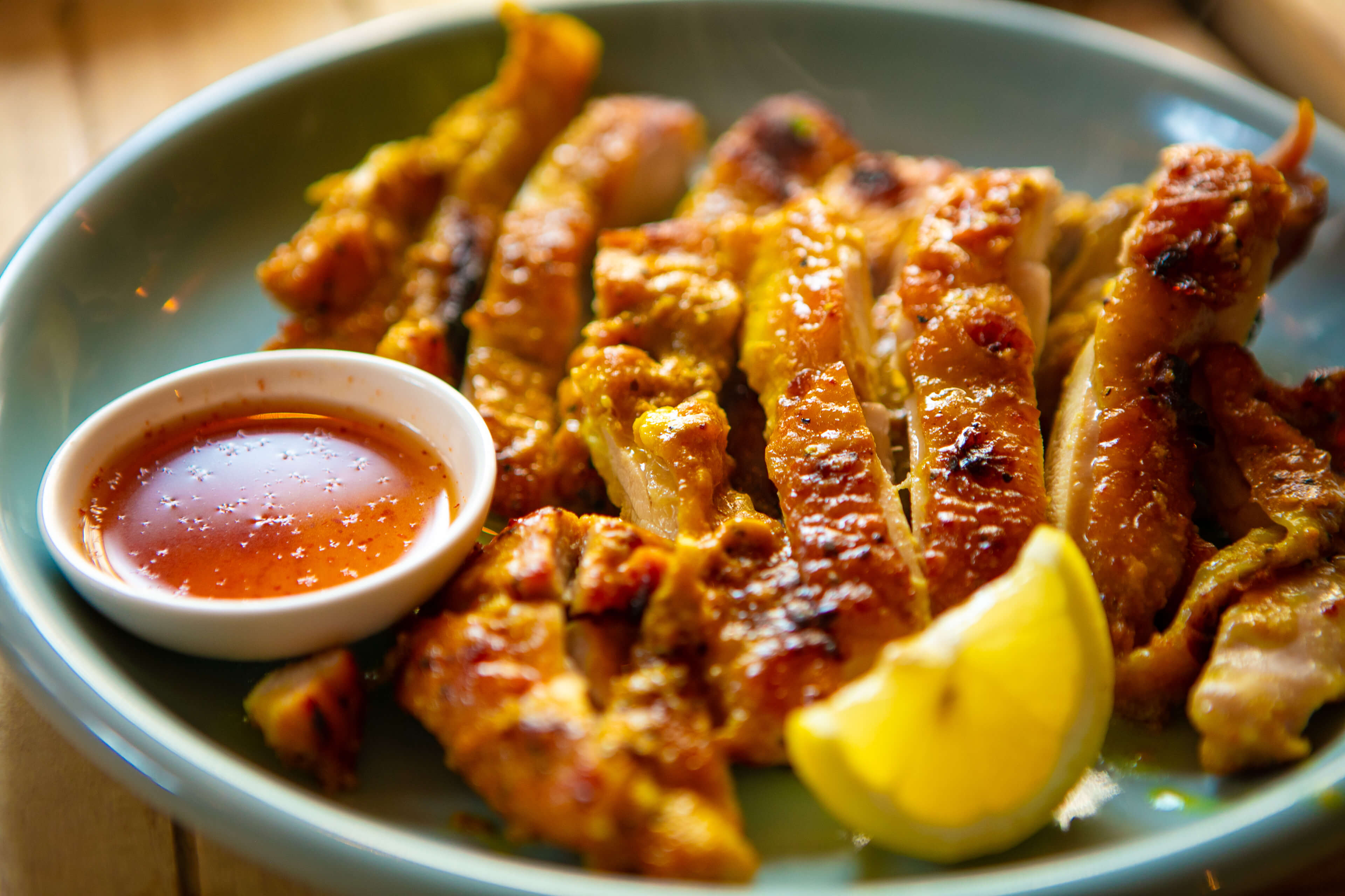 レモンをかけて食べる肉汁たっぷりのボリューミーなガイヤーンは、サウナ仲間たちとシェアしても楽しい。