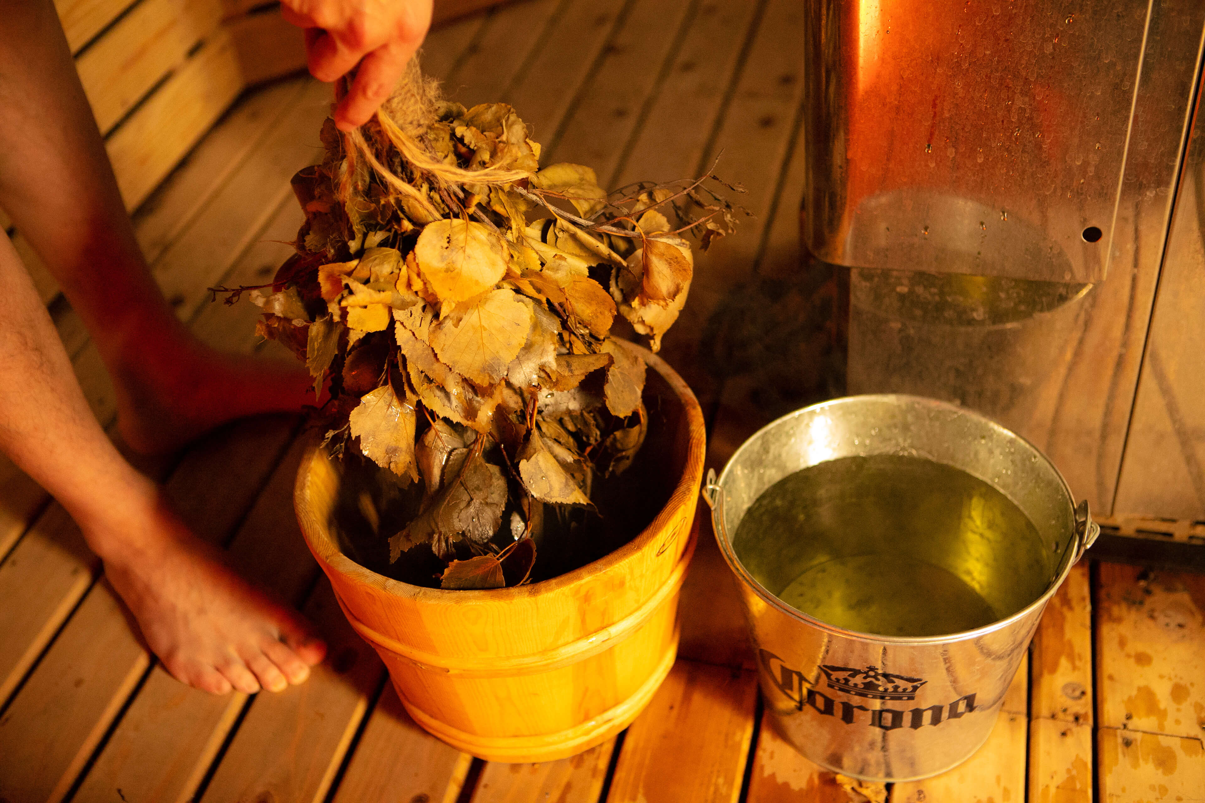 体が熱さに慣れてきたら、白樺の若枝を束ねて作った「ヴィヒタ」で体を叩いてみよう。フィンランドでは2000年前もから続く習慣で、叩く度に精油のようないい香りが漂う。