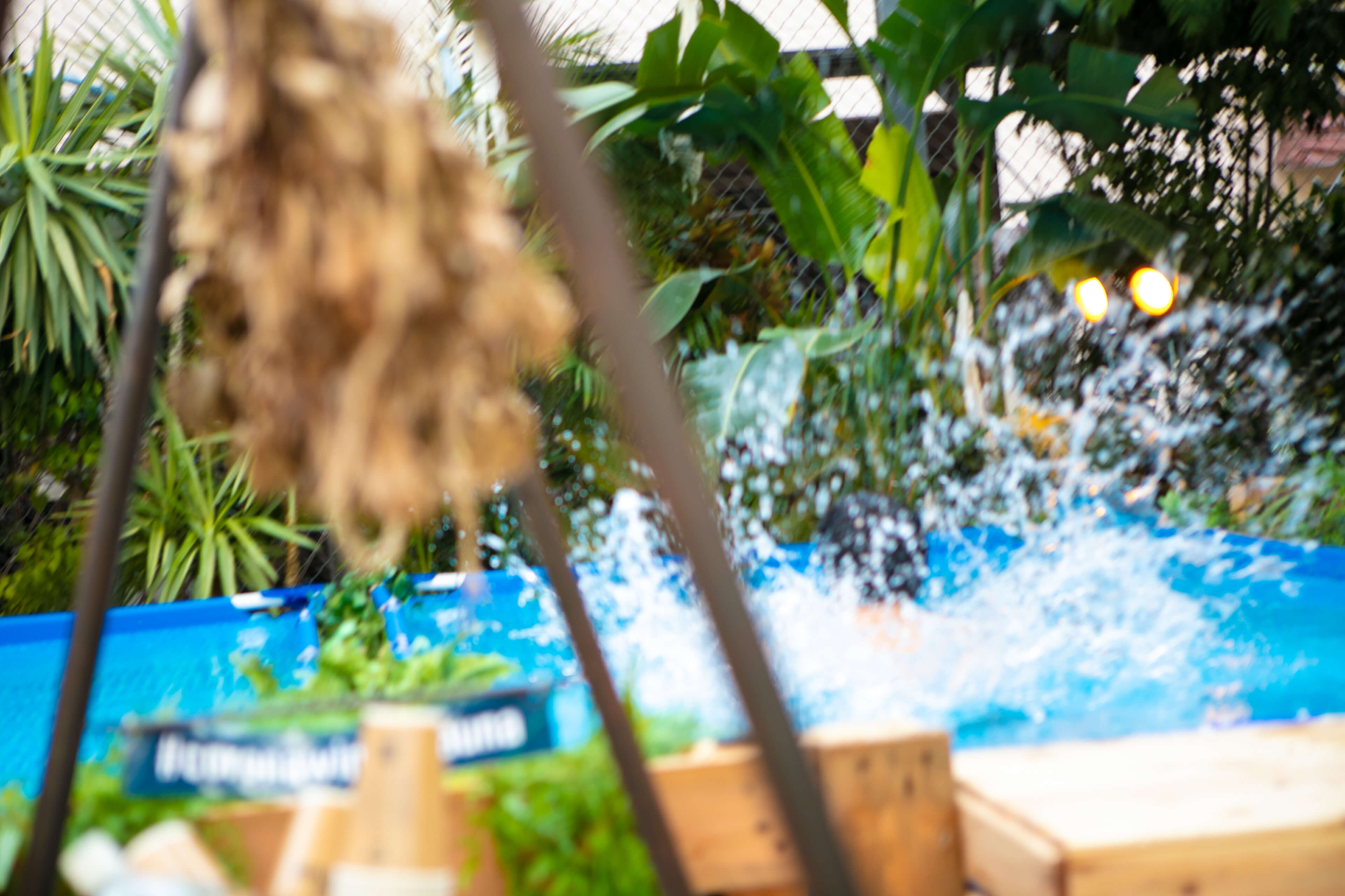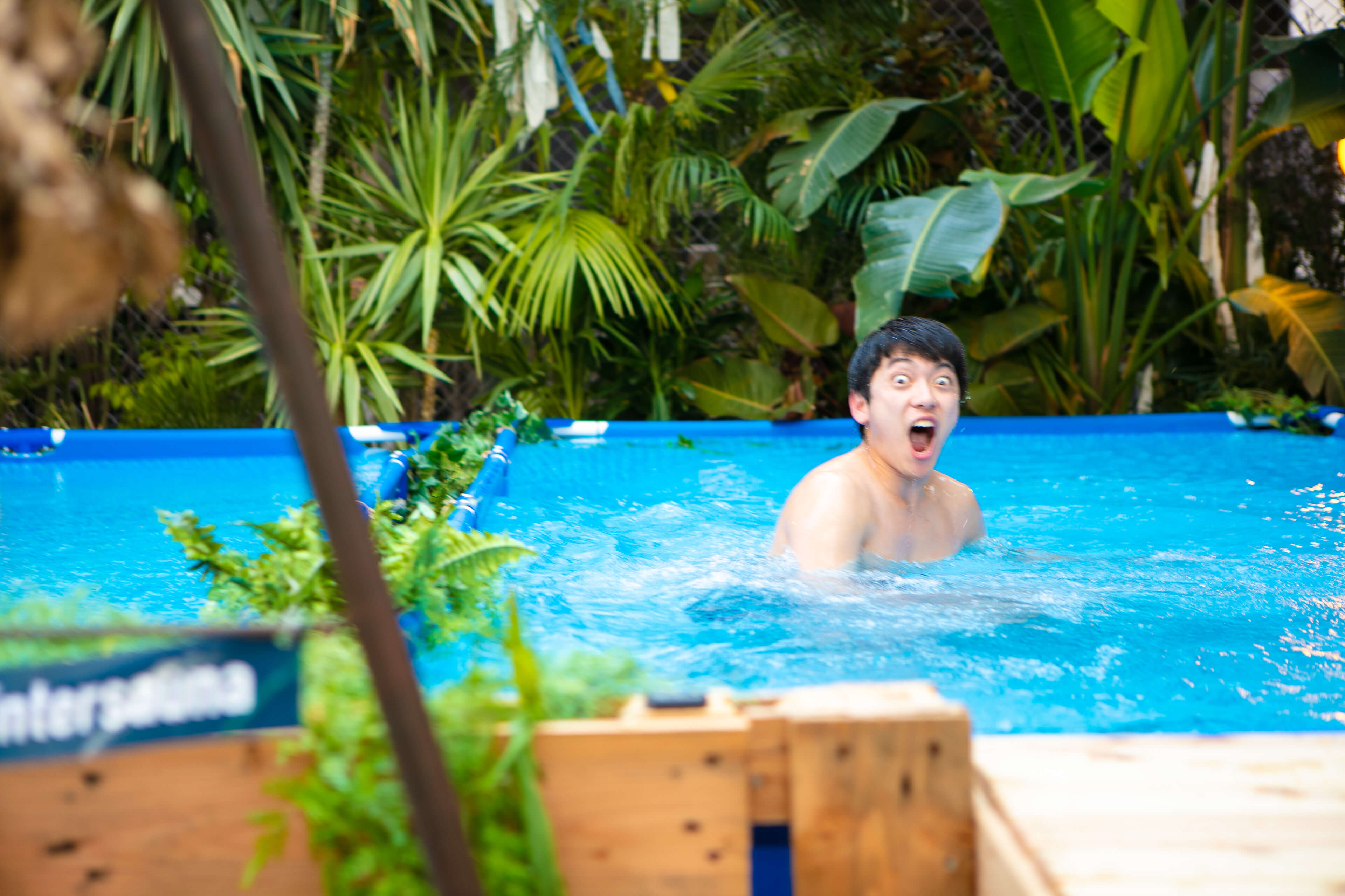 下北沢駅から徒歩3分。高架下にある「下北沢ケージ」前を通ると、フェンス越しに驚きの光景が目に飛び込む。真冬だというのに水着でコロナ片手に談笑する人、緑に囲まれたリゾートのような空間、謎のテントと屋外プール。そしてそのプールに水しぶきをあげてダイブする人もいるではないか。