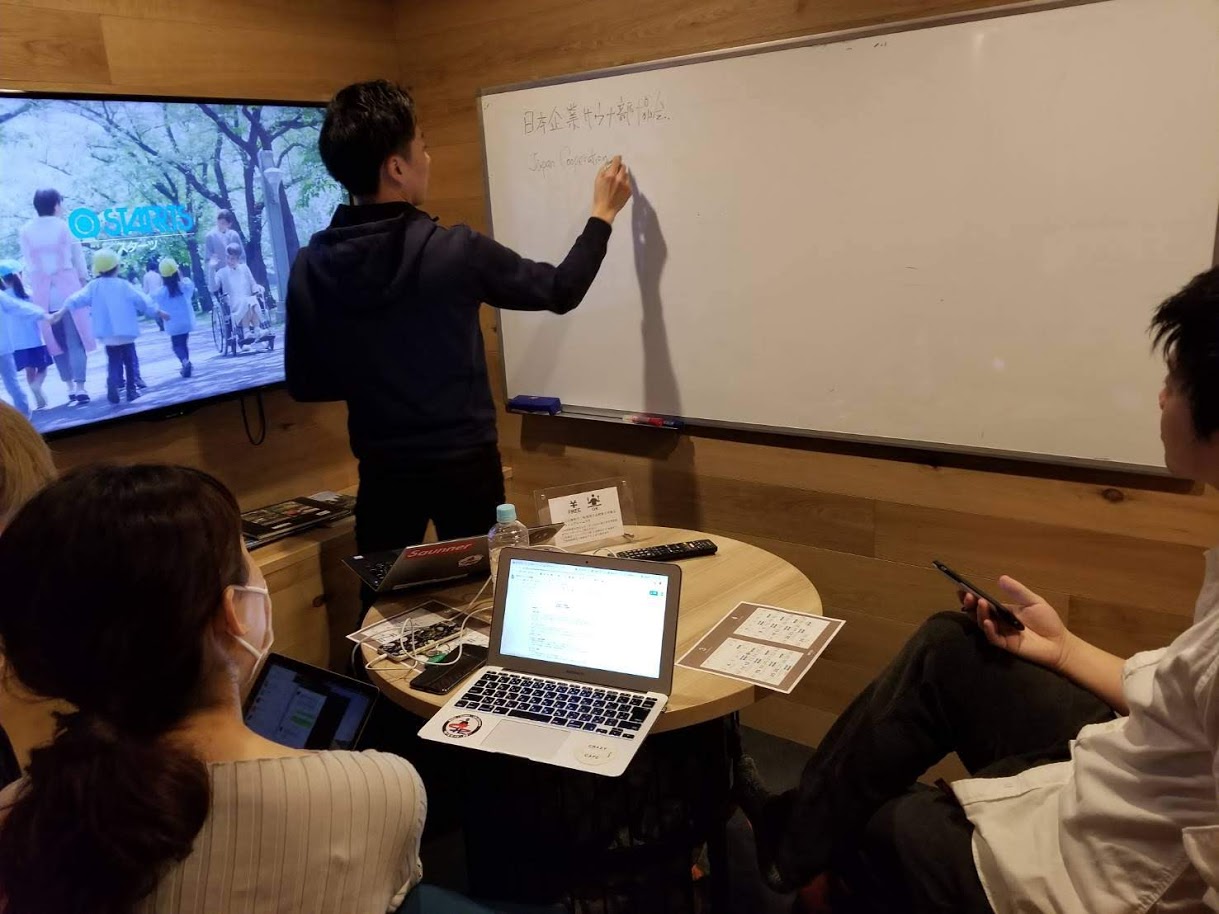 そんな2人がサウナ部の活動でよく利用すると言うのが「サウナ部会員制度」を創設したスカイスパYOKOHAMAだ。サウナ室に見立てたコワーキングスペースにはホワイトボードとプロジェクターも設置されている。