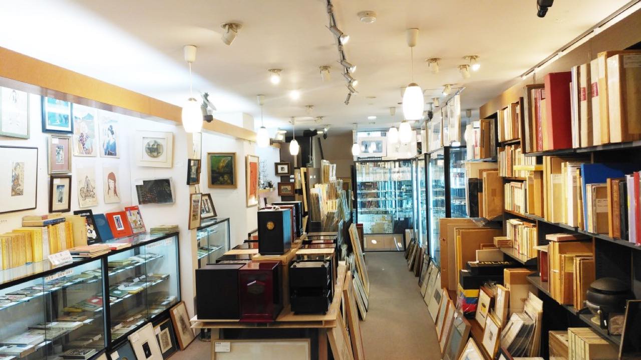 2階には美術館さながらのブックギャラリーがあり、近代の文豪たちの草稿や短冊などの稀覯本も閲覧可能。随時100点以上おかれているという大正ロマンを代表する画家、竹久夢二の珍しいコレクションも眺めることができるのもお店の名物のひとつ。