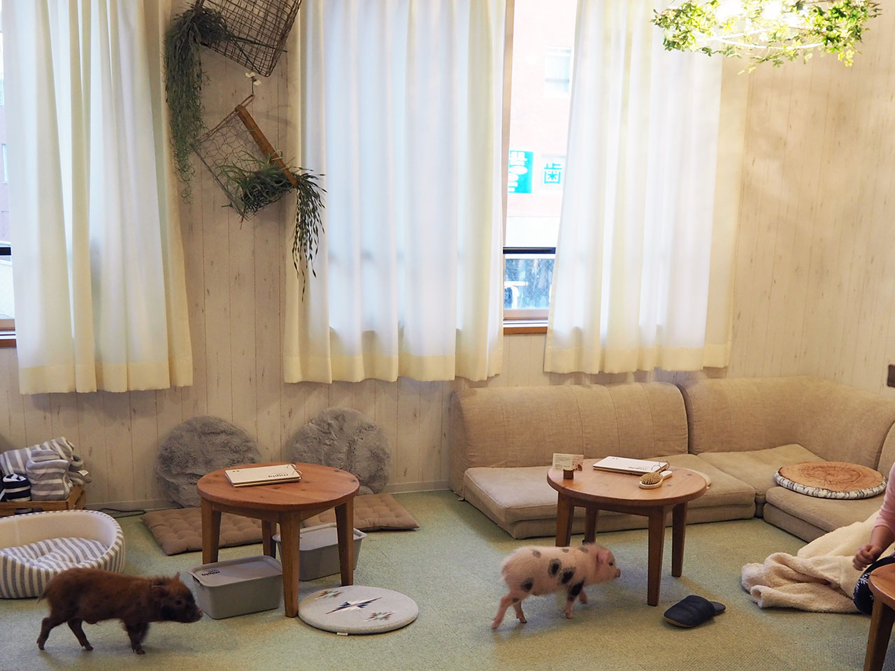 3階のラウンジには、生後1歳(黒と白)と7〜8ヵ月(白)の少し大きめのマイクロブタがくつろいでいました。
