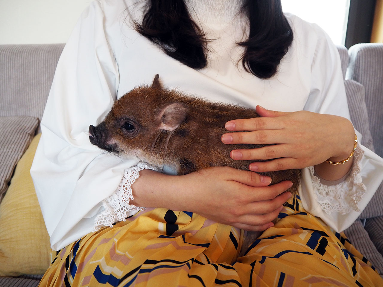 手のひらサイズの生後まもないマイクロブタと比べると、1歳のマイクロブタはけっこう大きい! と思いましたが、一緒に過ごしているとそのひと懐っこさがかわいくて。ちなみに、毛は少し固めで、肉球はネコに近くて、においはほとんどありませんでした。