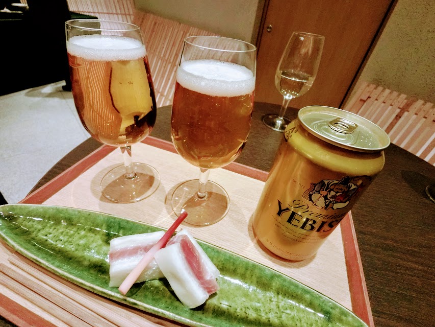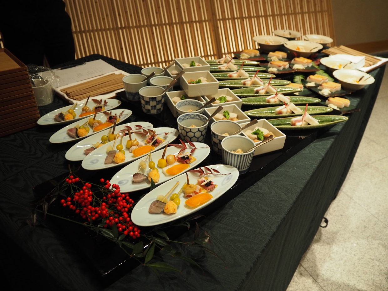 KYOGEN LOUNGEの目玉のひとつ、なかなかカジュアルには食べることができない老舗料亭「金田中」のフードをおつまみに贅沢なラウンジタイム。毎回演目に合わせて用意されるというユニークなメニューの数々にも注目すると、より料理を楽しめる。