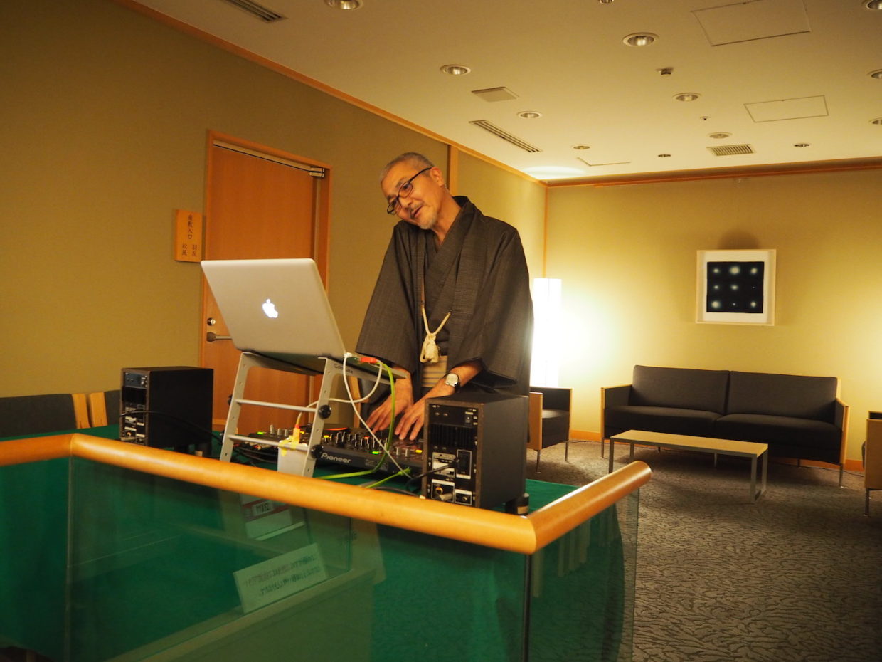 さらにホワイエにはDJブースがあり、開演までの時間、音楽でも気分を高めてくれる工夫が。盆栽や着物の帯締めなど和にちなんだショップの出店もあり、会場全体から和とモダンの融合を感じる。
