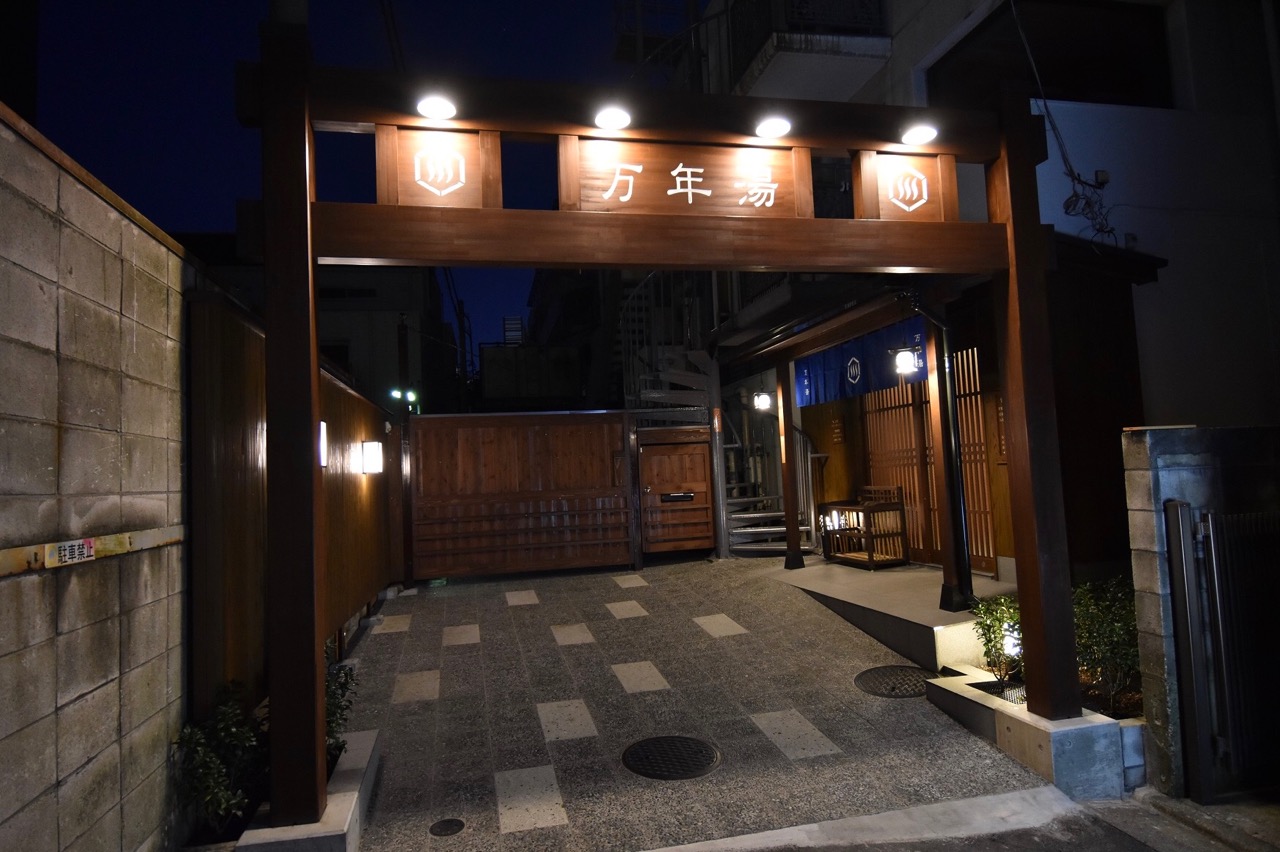 大久保通りを東へ進むこと5分、路地奥に鳥居のようなゲートを見つけたら、そこが「万年湯」の入り口だ。木のぬくもり溢れる和モダンな雰囲気で、まるで旅館に来た気分。