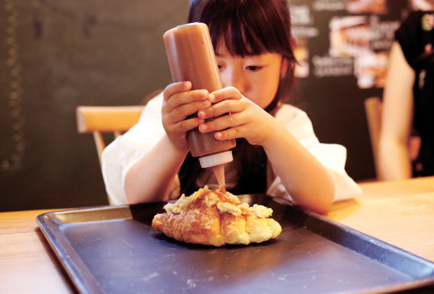 Kidsバリスタ体験では、こどもたちがバニラシロップとエスプレッソ、牛乳を注いでアイスバニララテをつくったり、チョコレートシロップに牛乳を注いでアイスココアをつくったり、キャラメルアーモンドクロワッサンをオーブンで焼いてお皿に盛り付けたりと、普段店員さんがお仕事でやっていることを楽しく体験できます。