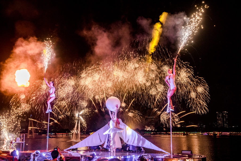 東京の摩天楼を一望できるロケーション。そして、花火と最新テクノロジーを駆使したエンターテインメントショー。毎回チケットが完売する人気ぶりを受け、3度目の今回はさらにスケールアップ。会場をベイエリアが一望できる豊洲に変更した。