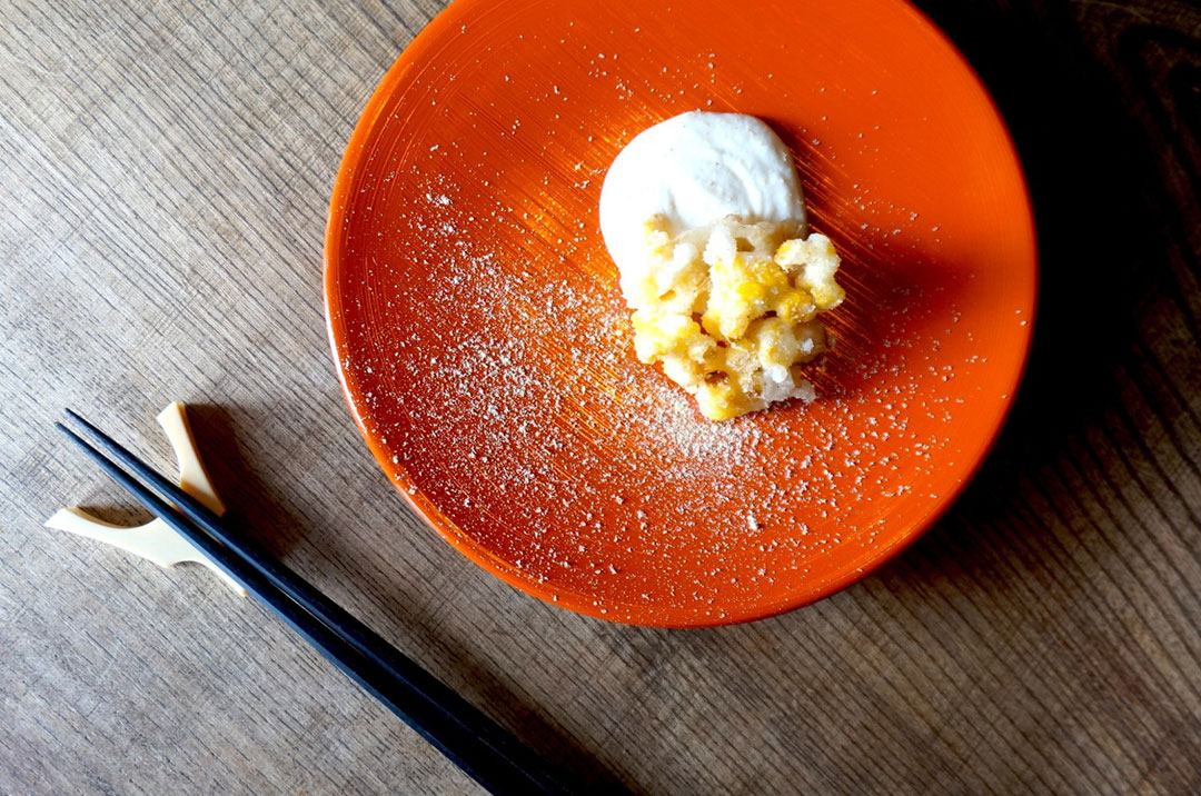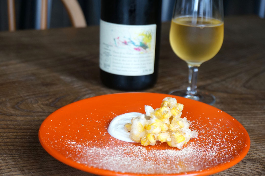 この日のスターターは「トウモロコシの白和え」。ペアリングの微発泡のナチュールワインと供に現れた「白和え」は、かき揚げにされた旬の甘いトウモロコシにフェネグリークとナツメグを振りかけ、和え衣が添えられている。