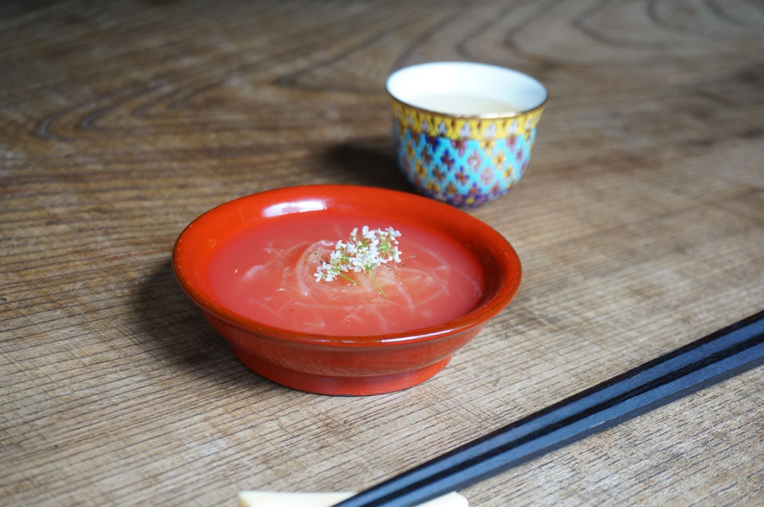 中盤には、そうめんカボチャとスイカの果汁でスープのように仕立てた一皿を挟む。トマトの甘酸っぱさが加わったスイカの果汁と瑞々しいそうめんカボチャの組み合わせは、優しく繊細でありながら全身で夏を感じられる。