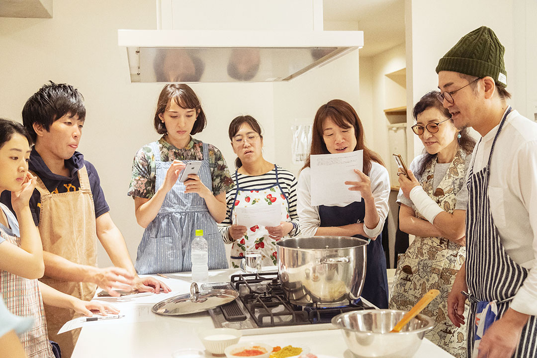 しとしと雨が降る日にも関わらず、開始時間には一般応募の参加予定者全員が到着。主催するHarumariTOKYO編集長の挨拶や、高木さんの紹介などを経て、みんなでエプロン姿に。「使うスパイスは、ターメリックとコリアンダー、チリパウダー。初心者の方はレシピ通りの材料を準備したり、下ごしらえをしてから調理を初める事を心がけてください」。キッチン周りに集まった参加者たちに高木さんがレクチャー。