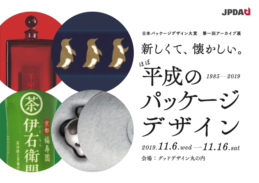 「日本パッケージデザイン大賞第1回アーカイブ展『新しくて、懐かしい。ほぼ平成のパッケージデザイン1985-2019』」は、1985年の第1回から2019年(平成31年/令和元年)の第18回までの大賞・金賞受賞作品61点が展示され、34年の軌跡を振り返る。