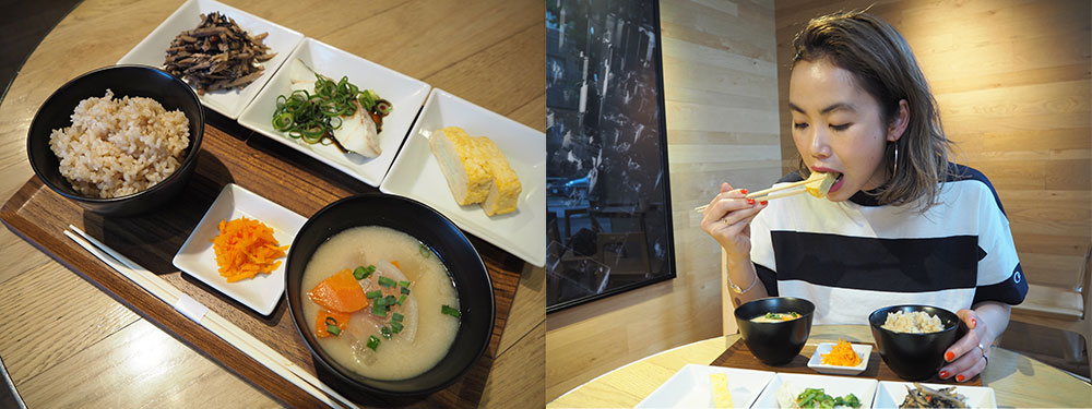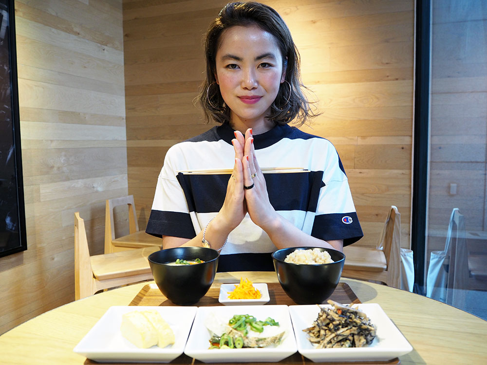 まずは冨岡さん一押しの「おばんざいセット(¥1,200)」。選んだおばんざいは「新ごぼうとひじき 大豆のピリ辛発酵醤油和え」「たらの昆布蒸し」「玉子焼き」。玄米と豚汁にお漬物も添えて。忙しい最中にこれだけの品数を作るのが難しいから、本当にありがたい…!