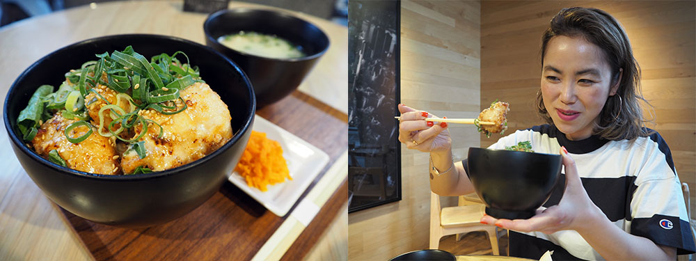 続いては、お店でも人気という「特製唐揚げ丼(¥1,000)」。見た目はしっかり、ジューシーな唐揚げだが、実は高タンパクな胸肉。塩麹のほのかな甘みと片栗粉のサクサクの衣が絡み合い、さらに豆乳で作られたというマヨネーズが相まった最高の味わい。唐揚げがゴロゴロ入っていて、個人的にはこれがナンバーワン。