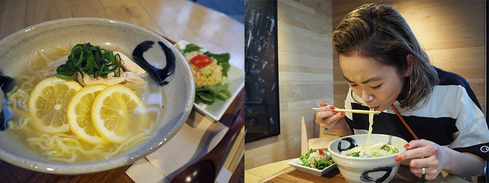 そして「レモン風味の鶏ラーメン おばんざい付き(¥1,000)」。米粉といわれても、もはや素人にはその差はわからない。レモンの爽やかな香りが食欲をそそる。付け合わせにおばんざいが一品付く。ラーメンなのにこんなに罪悪感なく食べられるなんて。以上3つのメニューを平らげてもなお、他のメニューも食べたくなってしまう