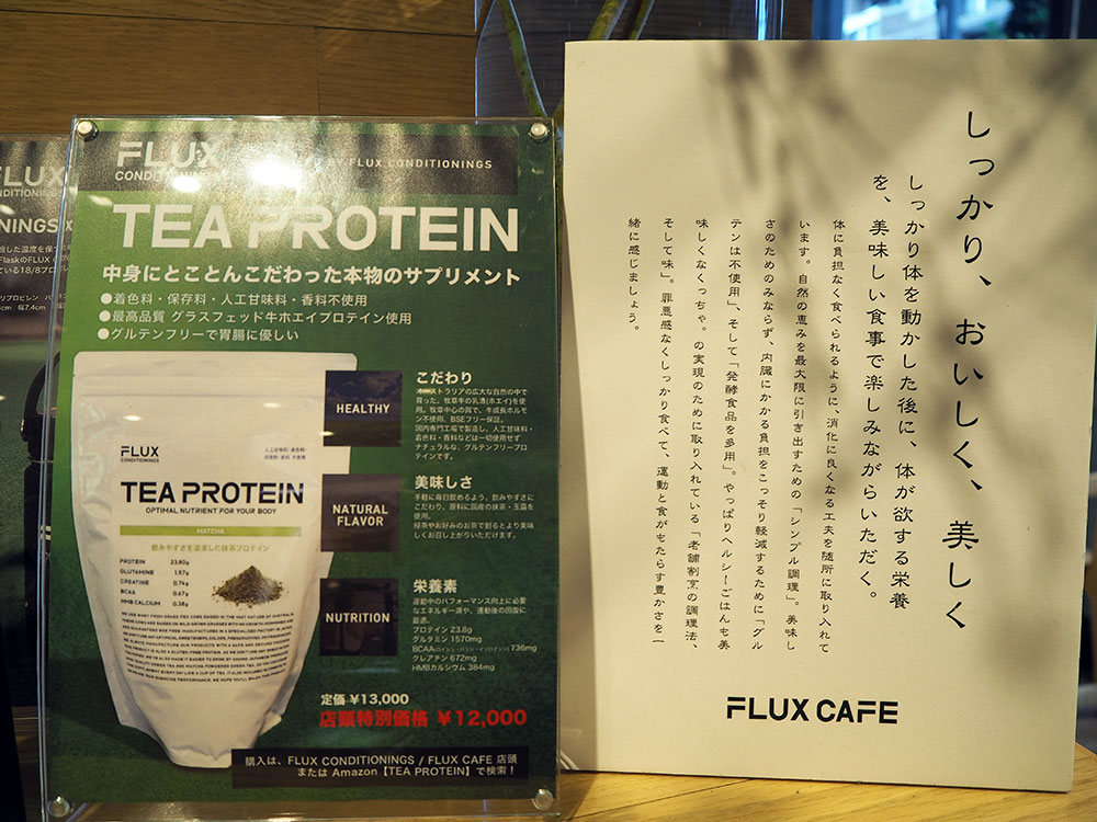 最後は「フラックス カフェ」がプロデュースしているというプロテイン「TEA PROTEIN」で作られたプロテイングリーンティー(¥600)をデザート代わりに。