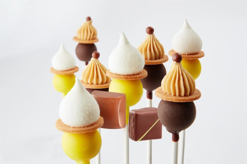 黄色はシトロンのクリームや、マーマレードをブランデ包んだボールの上に、シトロンのサブレとメレンゲを乗せたもの。茶色は、クレームショコラとキャラメルを入れたノワールのボールの上にサブレやミルクジャムクリームなどをトッピングしている。一口でケーキを食べたような満足感のあるスイーツだという。