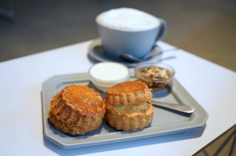 おすすめを伺い、ウバのティーラテと自家製スコーンのセットを。ほどよいコクと渋み、爽やかな香りが特徴のウバはミルクと相性がいいといわれる紅茶のひとつ。じっくり煮出し、雑味を取るために丁寧に濾してからミルクとあわせる。