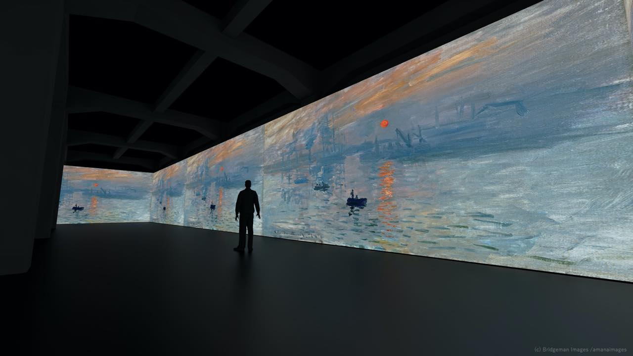 注目ポイントは、没入感ある空間だけではない。たとえば、モネが描いた「印象、日の出」。19世紀の当時にモネが見た景色を再現するため、フランスのル・アーブル港と絵画をCGで融合する。他にも、「モネの連作」として、時間軸の違う同じ風景を切り取り、連続的につなげて投影。画家が見てきた映像を疑似体験できる仕組みだ。