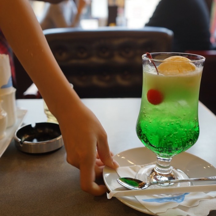 上野にある老舗喫茶店「ギャラン」。ここは老若男女が集う現役の「大箱」喫茶店だ。洒落た現代風の喫茶店でなく、サインやカーペットの柄、そして音楽からスタッフのユニフォームまで、全て「昭和」が香るギャラン。ハイカラなドリンクとして人気を博したクリームソーダのルックスは昔のままだそう。さくらんぼの赤さも含めてこれぞ正統派“喫茶店のクリームソーダ“だ。思い切り昭和気分を味わいたい。