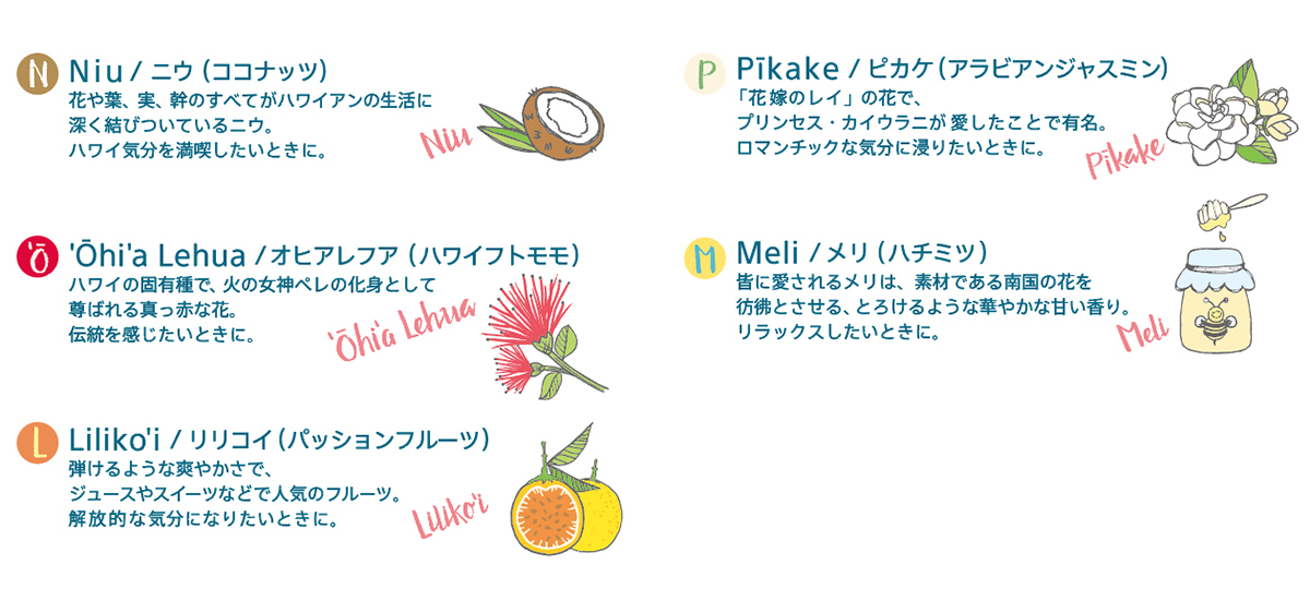 甘い香りが特徴のニウはハワイ気分を満喫したいときに、甘さと爽やかさのバランスのよいオヒアレフアは気分をリフレッシュさせたいときに香りたい。またリリコイは柔らかい柑橘系の香りで開放的な気分にさせてくれる。ピカケはエレガントな香りで華やかに楽しみたいときに、メリは就寝前のリラックスタイムに最適だ。