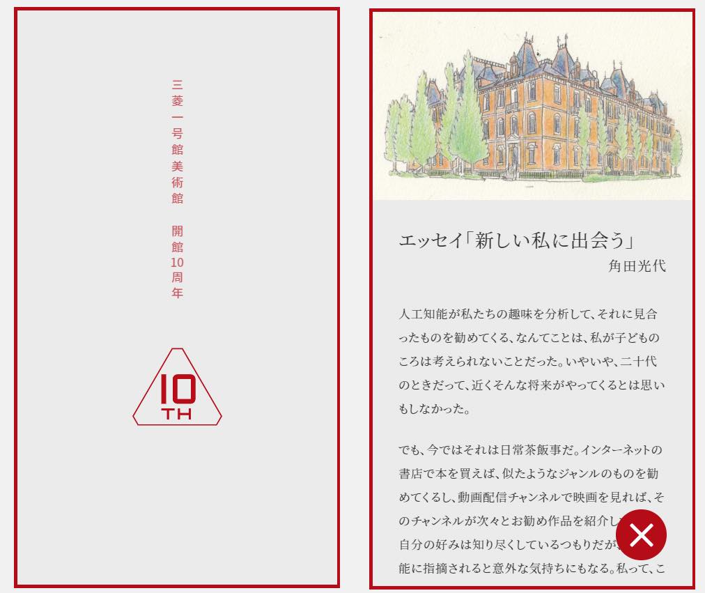 まず、トップページを開くと、アーティストやデザイナーなどの著名人インタビュー、コラム、エッセイ等にアクセスすることができる。ここに掲載されているのは三菱一号館美術館のオリジナルコンテンツで、ここでしか読むことができないものばかりだ。