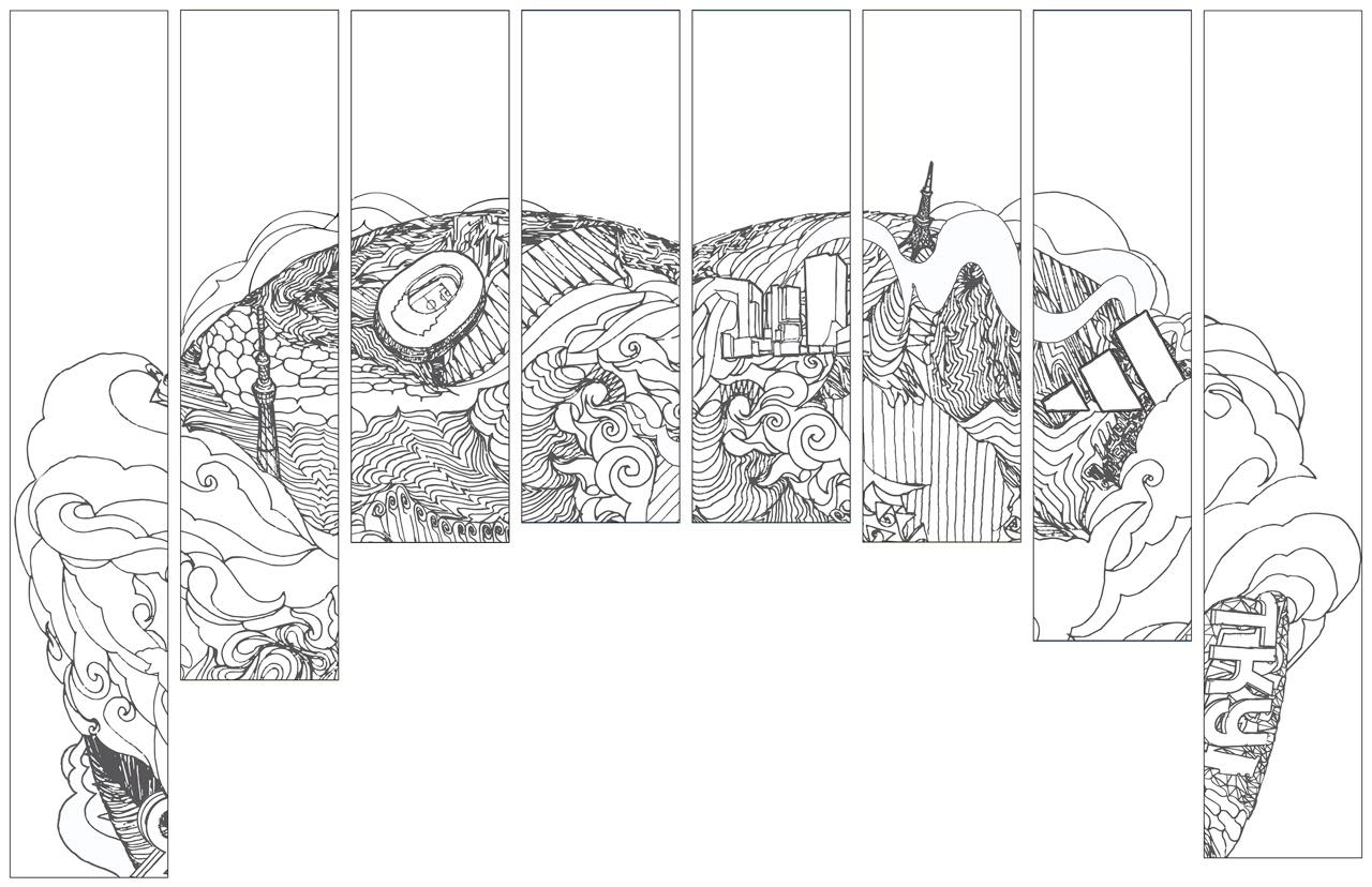 エントランスには、一筆画家で知られるNANDE(南出直之)が手掛けた暖簾型のエントランスバナーを設置。1階から2階に渡って吊り下げられたバナーデザインは、東京のジェンダーやジェネレーションなどを表現する森羅万象をイメージしたもの。アーチ状に配置したのは地球という球体を意識したという。
