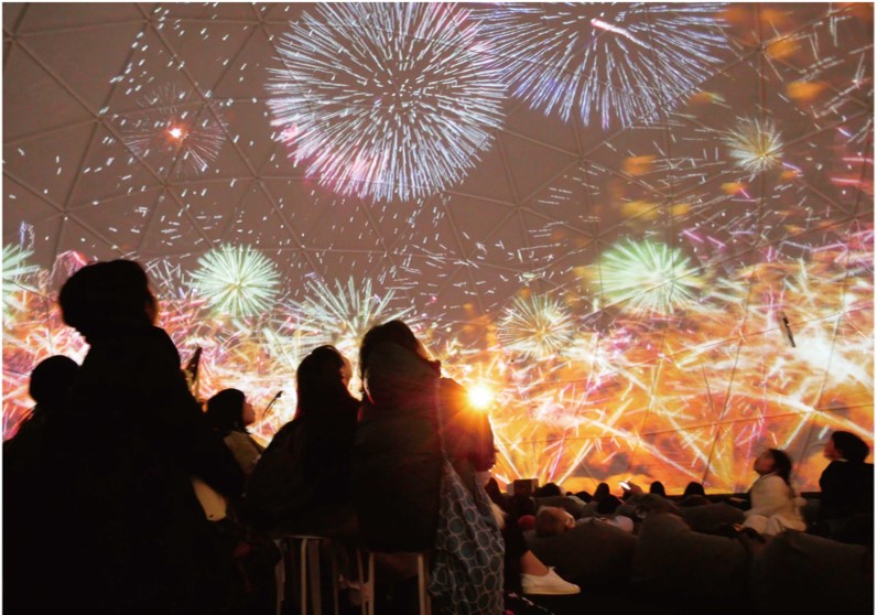 「ハナビリウム~花火って、なんであるの?」は、現役花火師らが10年もの歳月を費やし、試行錯誤の末に完成させたという花火の物語だ。実際に打ち上げられた約5000発の花火実写映像に加えて、江戸時代から400年以上も積み重ねられてきた歴史と技術を学べる内容となっている。映像にはフルドーム用に特別に設計された最先端の演出花火 「hanabi-rium360(R)」を使用し、360度全方位から5,000発が打ちあがる花火鑑賞を可能にした。