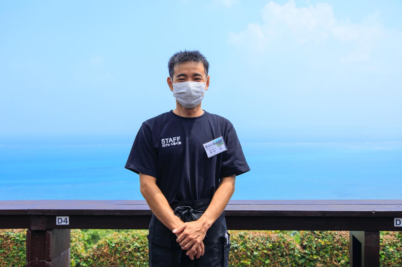カフェくるくまのもうひとつの目玉は高台から沖縄の青い海が180度のパノラマで眺められること。この日は夏の暑さもあり室内で食事をする人が多かったが、気温がもう少し下がってくれば、密を避けられるテラス席で絶景とともに食事するのがベストかもしれない。