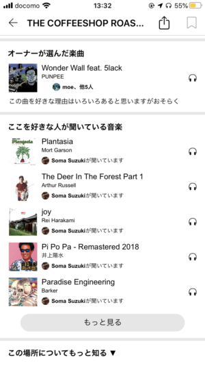 おすすめされた場所のなかから気になる場所をタップすると、その場所についての詳細や、そこの場所を好きな人が聴いている音楽のリストを見ることができる。お店によってはオーナーが好きな楽曲と、その楽曲を選んだ理由が記載されているところもあるので、どういう感性を持った人がオーナーなのか知ることができるというわけだ。