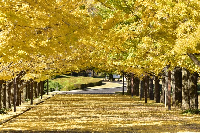 ここでは現在、11月29日(日)までの期間で「黄葉紅葉まつり」と、夜間ライトアップイベント「秋の夜散歩(あきのよさんぽ)」を開催している。今年は台風の影響が最小限となったため、公園の木々には多くの葉が残っており、とても鮮やかに色づいている。園内のおすすめスポットは、「かたらいのイチョウ並木」。まるで黄金のトンネルにいるかのような美しい黄色のイチョウが、足元から頭上まで輝く光景は圧巻。11月半ばから見頃を迎えている。