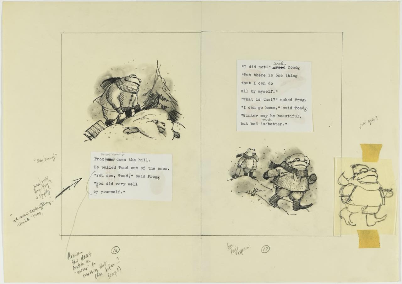 後半は『ふたりは ともだち』『ふたりは いっしょ』『ふたりは いつも』『ふたりは きょうも』の4冊から成る「がまくんとかえるくん」シリーズの展示。スケッチ約100点のほか、初期段階の構想が書かれたノートや台割、編集者の書き込みの入ったレイアウト、表紙の下絵などなかなかお目にかかれない貴重な品々が初公開されているので必見だ。決して説教じみることなく、ユーモアを交えながら人間の真理を温かく描いた稀代のストーリーテラー、ローベルのものづくりの過程をつぶさに見ることができることが嬉しい。