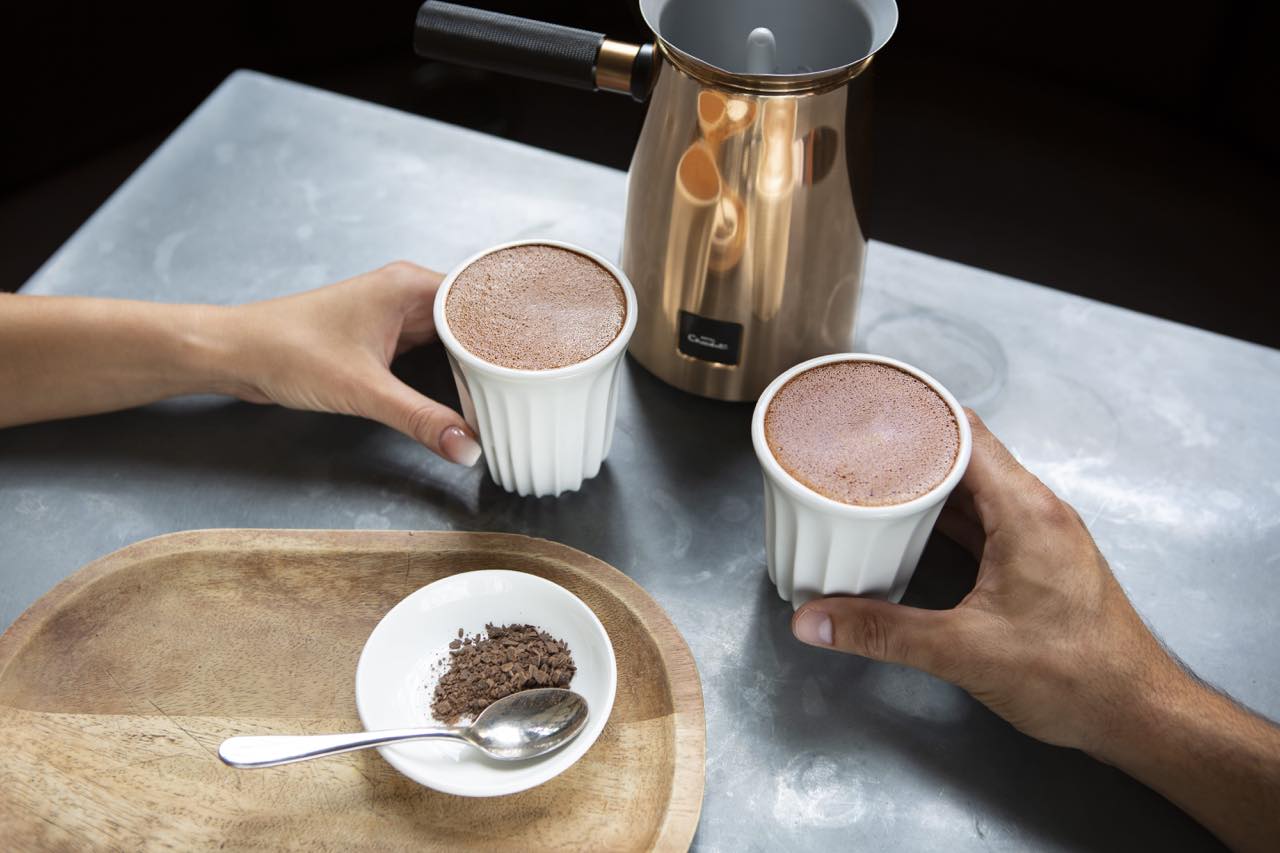 「Velvetiser」の魅力は、手軽においしいホットショコラが作れること。実際に家で作るとなると、鍋を火にかけて、チョコレートが焦げ付かないよう注意しながら泡だて器でかき混ぜる、といった作業が必要になるが、「Velvetiser」を使えば、チョコレートフレークと牛乳を入れて、あとはボタンを押すだけ。わずか2分半で、ベルベットのようなクリーミーな口当たりのホットチョコレートが楽しめるのだ。もちろん、アイスドリンクや、ショコラソース、ショコラムースなどのアレンジレシピも作ることができる。