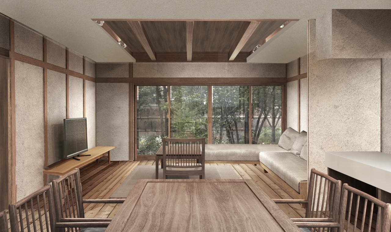 そんな「由縁別邸 代田」の向かいにオープンするのが、“離れ”だ。長期滞在向けレジデンシャルスイートは、リビング、寝室、キッチン、バスルーム、家具、家電を備え、出張や住み替えの合間など、1〜3ヶ月のロングステイ向けサービスとなっている。滞在者は、本館の温泉付き大浴場を無料で利用できるほか、割烹や茶寮でのお食事割引もある。もちろん光熱費やインターネット使用料も含まれているため、ワーケーションにもうってつけだ。