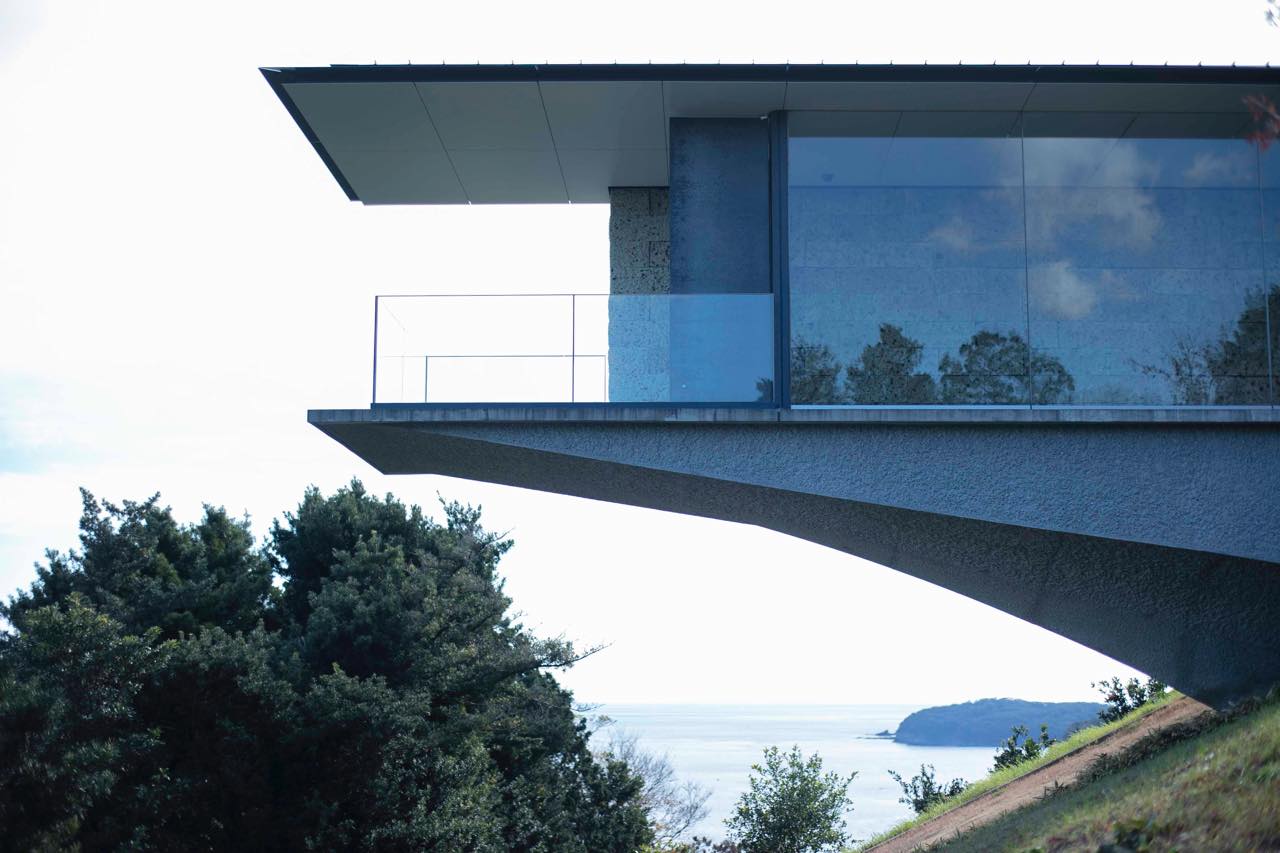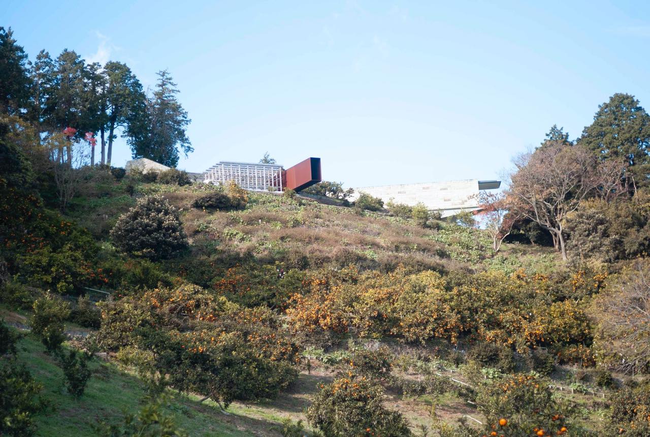 「江之浦測候所」があるのは、神奈川県小田原市。みかん畑が広がる山腹に広大な敷地が広がっている。電車で行くなら、JR東海道線の根府川駅が最寄り駅。東海道線のなかで唯一の無人駅で、降り立ったホームからは大海原が望める。無人駅といえど、毎時4本程度のダイヤで電車が止まるうえ、東京駅まで1時間半と乗り換えなしで行けるのでアクセスも抜群だ。そこから専用バスに乗車し、湾曲する山道を10分ほど進んで行く。坂を登っていく道中でみかんの甘酸っぱい香りが漂ってきたら、江之浦測候所に近づいてきたしるしだ。