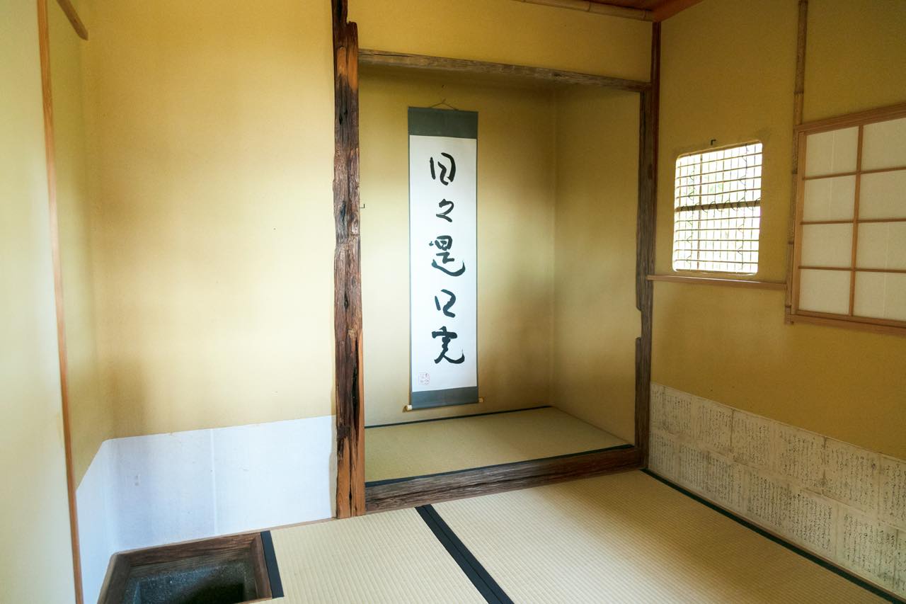 この時期に行くならぜひチェックしておきたい旬の場所がある。それは茶室「雨聴天」だ。パンフレットには「千利休作と伝えられる茶室『待庵』の本歌取りとして構想された(もの)」と説明されている建築物。茶室は2畳の広さで、壁は土壁で、質素な造りとなっている。そのうえ、屋根材はみかん小屋で使っていた錆びたトタンで、雨が降ると雨粒がトタン屋根を叩くという演出がある。
