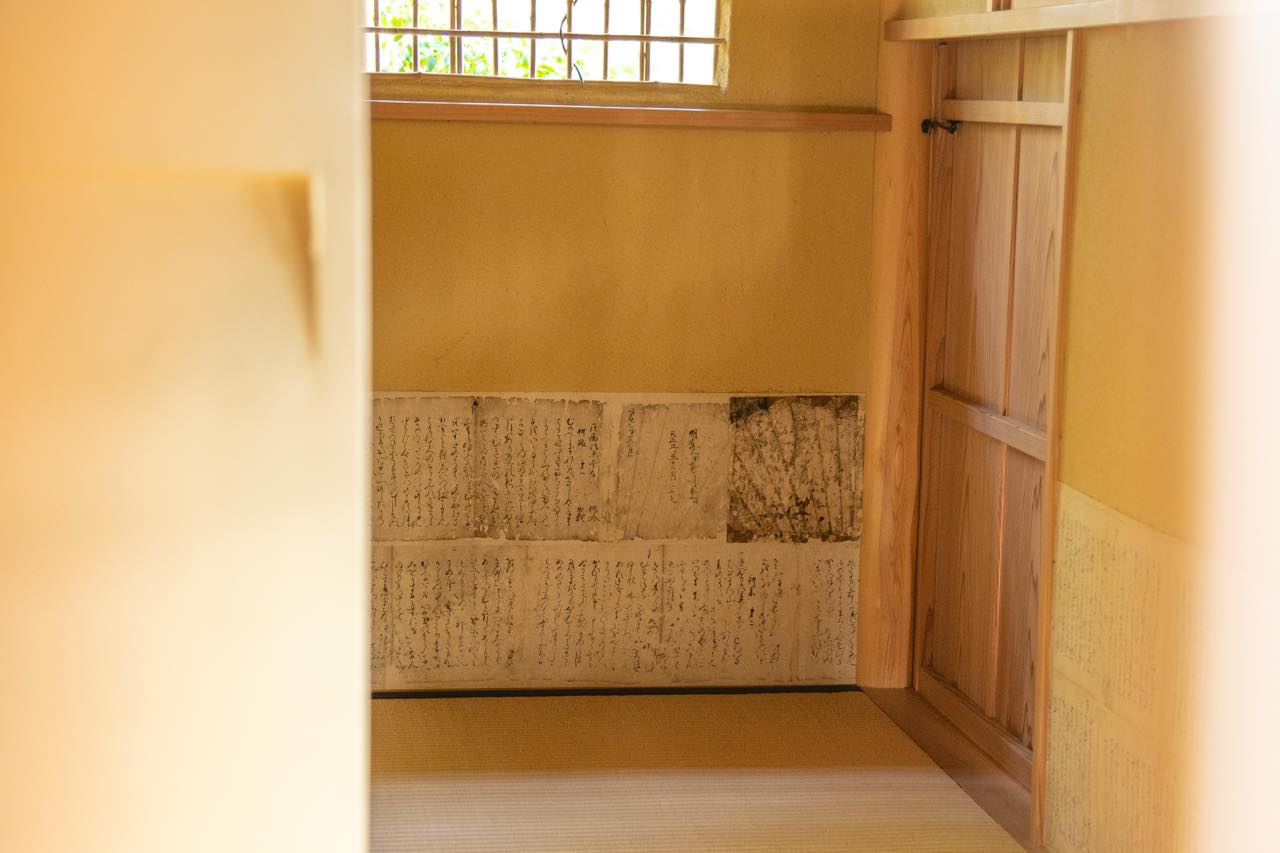 さらにその下に目をやると、猪苗代兼載の独吟『聖廟法楽千句』の写本が貼られている。稲益さんによると、この写本が、先日発売した「江之浦奇譚」の表紙に使われているとのこと。このように杉本さんの最近の活動が凝縮されているのがこの茶室なのだ。彼の最新作「江之浦奇譚」の世界を体感しておきたい。