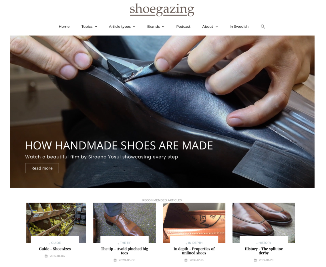 靴磨きを続けていくと、テクニックをはじめ革靴にまつわる情報がもっと知りたくなってくる。そこでチェックしたいのがグローバルメディア「shoegazing」だ。革靴の「HODINKEE」的存在ともいえる同メディアは、ジャーナリスト、ジェスパー・インゲヴァドソン氏の紳士靴への探究心からブログからスタートしたサイト。今では、メディアとして世界中の熱心な革靴愛好家から支持を得ており、世界の靴磨き選手権を主催するほど大きく展開している。革靴のケア方法から靴の買い方ガイド、名だたるブランドの工場見学まで、日本のメディアには出ていない一歩先をいくトピックをチェックできるのがうれしい。このメディアをきっかけに知識が広がることで、同じ趣味を持つ人たちと交流も増えることだろう。