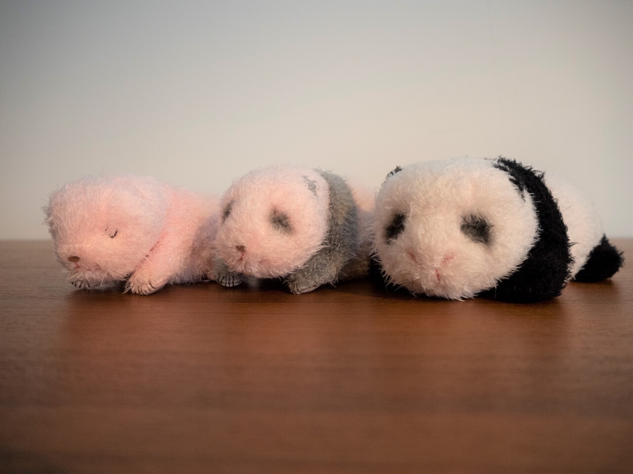 続いては、6月末に新たに双子の赤ちゃんが誕生したジャイアントパンダのぬいぐるみを紹介したい。シャンシャンの2日齢、10日齢、20日齢の頃をモデルにした「ほんとの大きさパンダの仔」シリーズが大変興味深い。見た目や大きさはもちろん、重さも実物を表現。生まれたてはこんなに小さいのかと驚き、短期間でずしりと重みを増していく、成長の早さに心が震える。赤ちゃんパンダの健やかな成長を願いながら愛でたい。