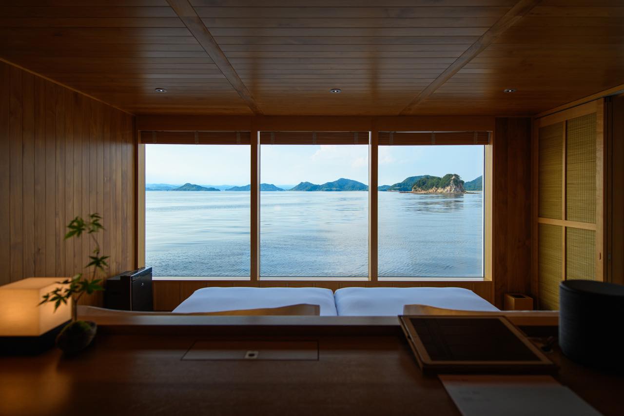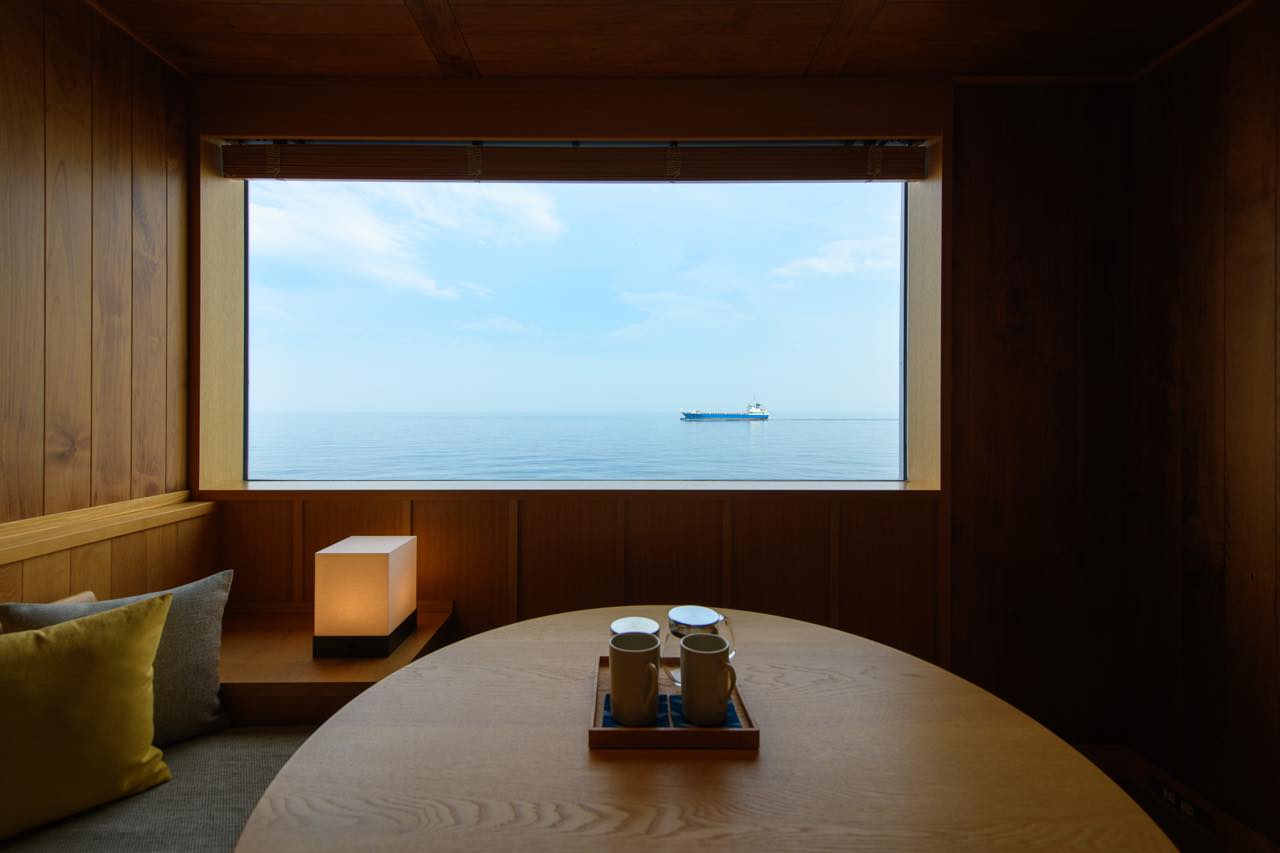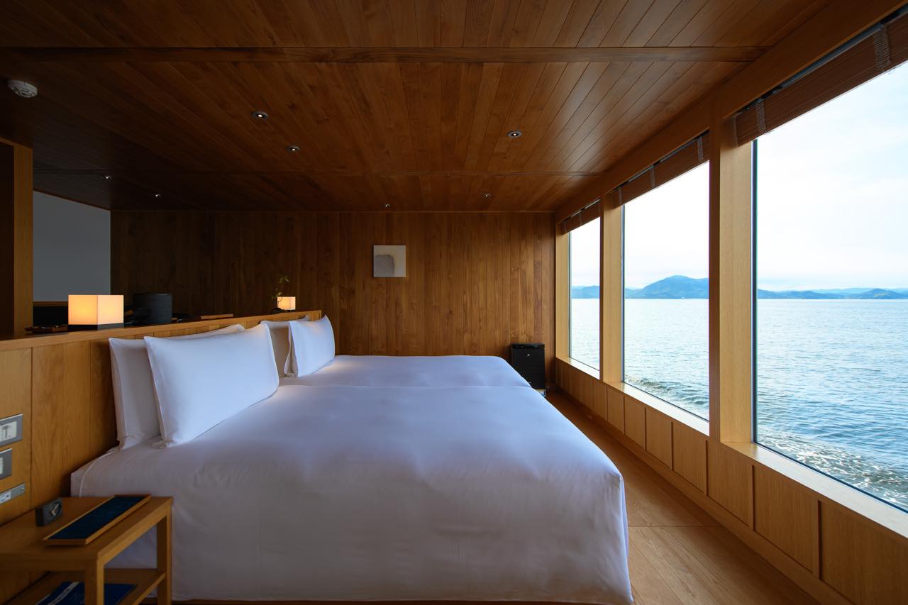 Indeed, the sensation of being close to the sea surface and becoming one with the ocean is an experience unavailable on large cruise ships. Designed to offer views of the Seto Inland Sea from every room, guests can savor the “Setouchi landscape” from any accommodation. While specific floor selection isn’t possible, the first-floor rooms, closest to the sea, are designed to align the eye level with the ocean, explaining their popularity.