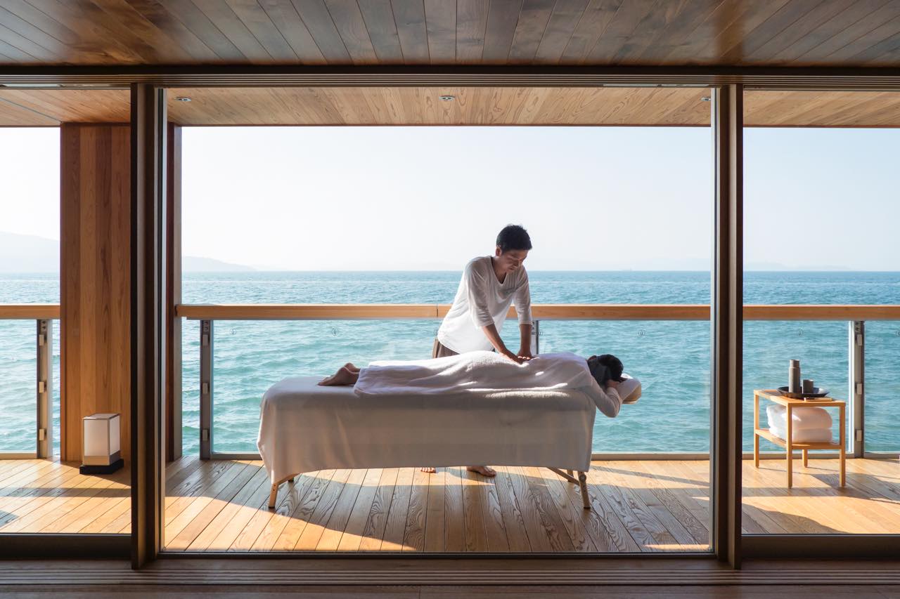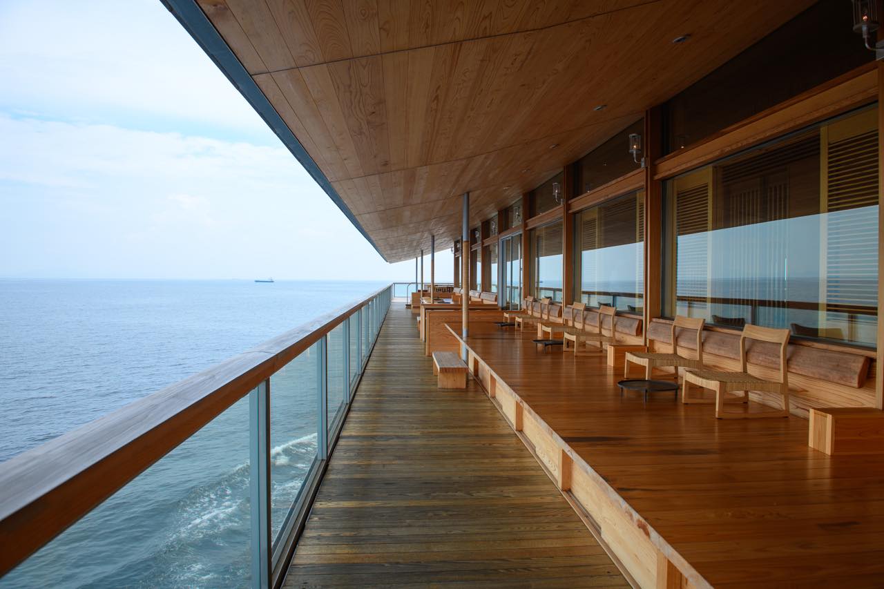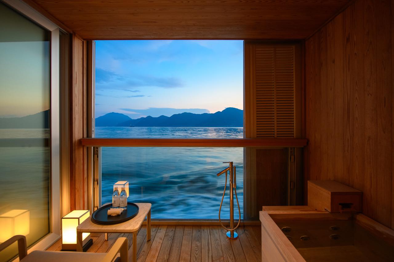 Indeed, the sensation of being close to the sea surface and becoming one with the ocean is an experience unavailable on large cruise ships. Designed to offer views of the Seto Inland Sea from every room, guests can savor the “Setouchi landscape” from any accommodation. While specific floor selection isn’t possible, the first-floor rooms, closest to the sea, are designed to align the eye level with the ocean, explaining their popularity.