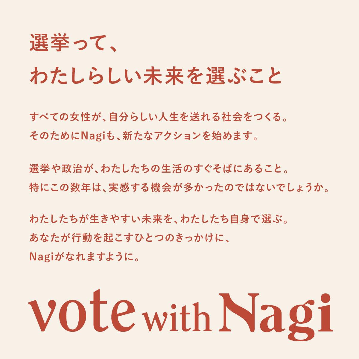 Vote with Nagi キャンペーンでは、今回の衆議院選挙への投票の証明書を提出することでお得に吸水ショーツが購入できるようになっている。さらにその売上から、女性支援をする一般社団法人Colaboに100円を寄付するようになっている。