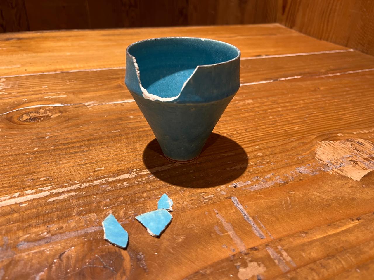 今回金継ぎに出したのは、学生時代に購入した陶芸家・鈴木麻起子さんの陶器だ。洗い物の際に落としてしまい、見事にパックリと割れてしまった。実は過去に一度金継ぎ教室に持っていったことがあったが、割れ方が細かいため修繕をするのは難しいと断られた物だ。それでも思い入れがあったため、破片とともに捨てずに取っておいたまま数年経っていた。カウンターで対応してくれた店員の方にも物によっては直せない物もあるといわれたが、後日きたのは修復可能という返事だった。それを聞いただけで、この陶器がどのように変貌を遂げるか期待が高まる。