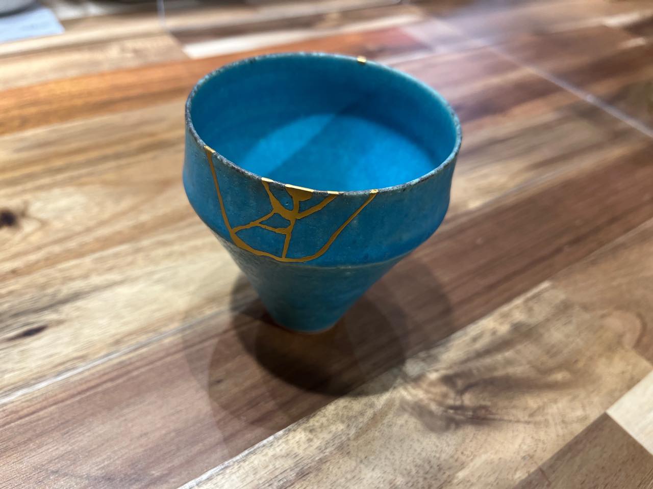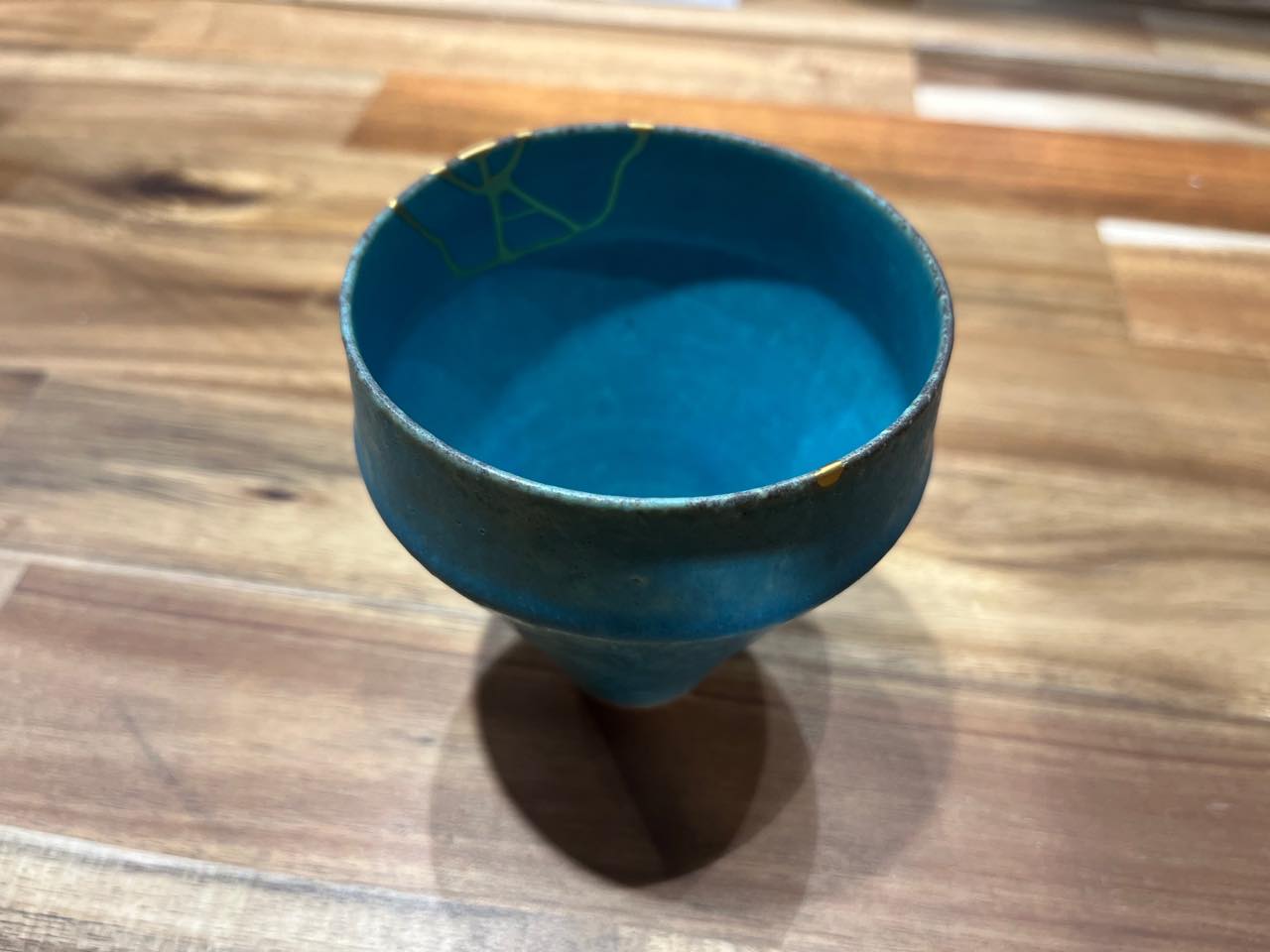 後日連絡を受けて陶器を取りに行ったが、その変貌ぶりに驚いた。割れている部分に沿って金が塗られており、花の模様みたいだ。鈴木麻起子さんのターコイズブルーの陶器に凛としたアクセントが加わり、上品な佇まいに仕上がった。まるで新品を購入したかのような満足感だ。もちろん、一度割れてしまっているので、電子レンジや食洗機NGなど強度は落ちるが、再び日常で使える喜びに勝るものはない。大事にしている器が割れてしまっても「ここで修理できる」という場所ができたことが心強かった。