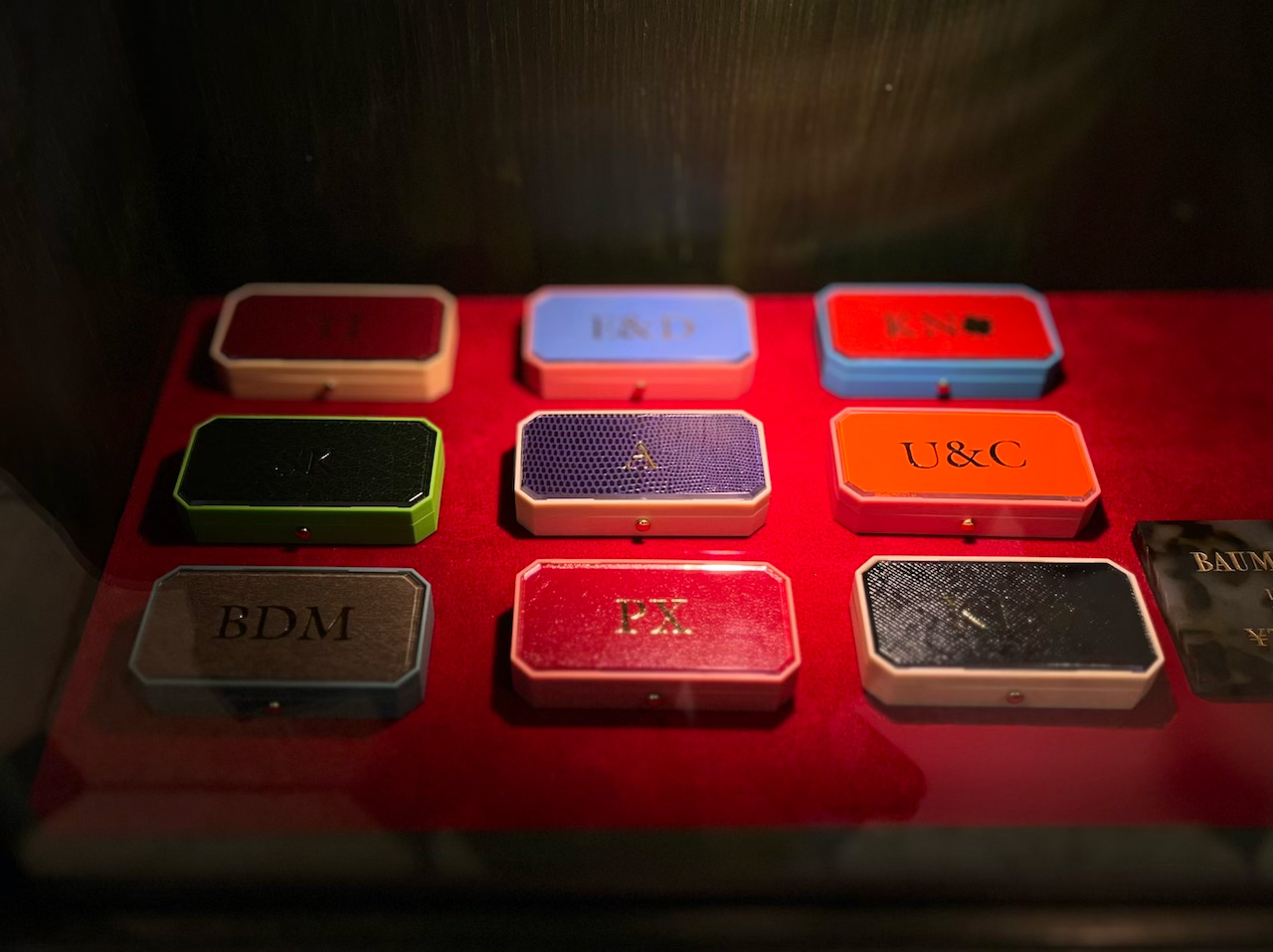 この絶妙な大きさのケースの色と表面の素材、そしてそこにラグジュアリー感のあるゴールドの刻印の文字を好きに選べる。さらにベロアの布ケースの色も好きなものをチョイスできる。しかもお店に行けばこのすべてをその場でそこまで待たずに完成させてくれる。普通はオーダーしてしばらくかかったりするが、その日にカスタマイズのギフトを買えるのは地味だが実はとてもありがたいポイント。