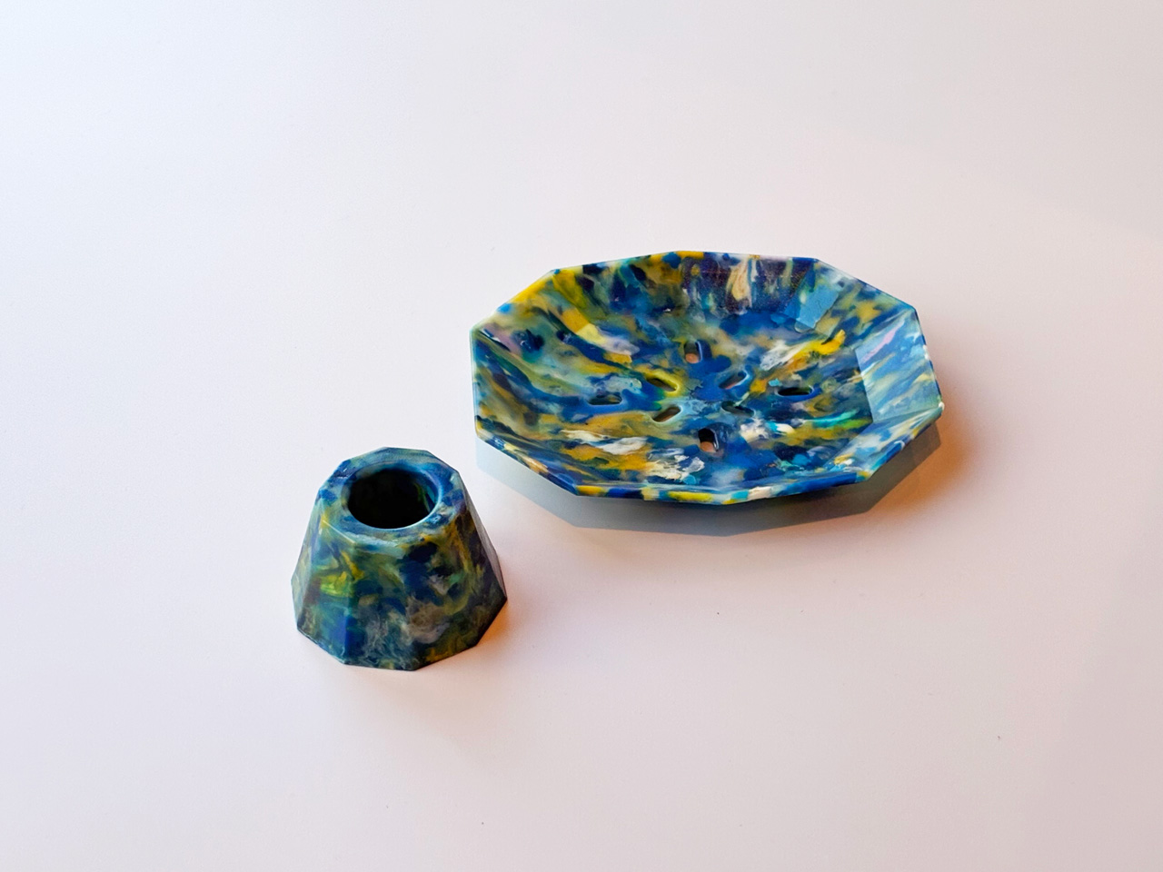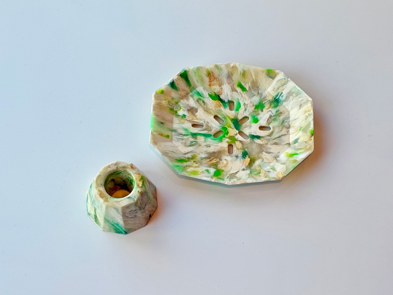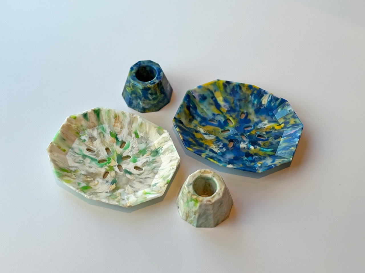 素材ごとに異なる溶解温度によって偶然生まれるドット柄やマーブル模様は唯一無二。素材が海洋プラスチックごみとは思えないほど美しい色合いを眺めながら、「これはどこの海を旅してきたのかな」「もともとは何だったんだろう」と、想像が自然と膨らんでいくことでしょう。