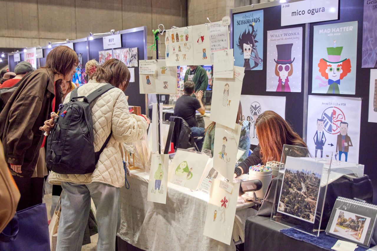 映画やドラマ、アニメのキャラクターを独自のタッチで描いたイラストや、思わず部屋に飾りたくなるアート作品がずらりと並び、まるで小さなギャラリーを巡っているような感覚だ。作家本人がブースに立っているため、「この絵はどんな作品?」「どんな思いで描いたの?」と気軽に会話できるのも魅力のひとつ。作品の背景を知ることで、1枚のイラストが特別な存在に変わっていく。