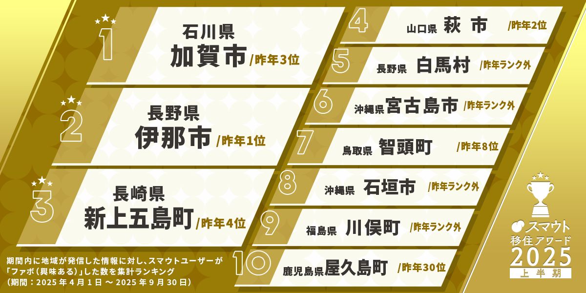 スマウトが年2回発表する、ユーザーが選ぶ「スマウト移住アワード」では、有名都市だけが上位に来るわけではない。例えば2025年上半期の結果は、長野県伊那市、長崎県新上五島町、石川県加賀市といった地域が並ぶ。「コミュニティが生きているところ、地域が積極的に発信しているところに人が集まる。知名度ではなく、どんな人がいるかです」