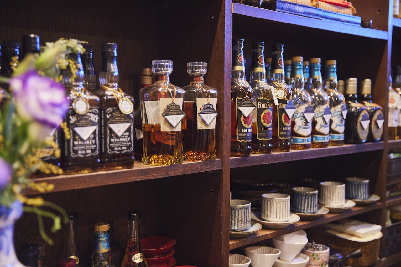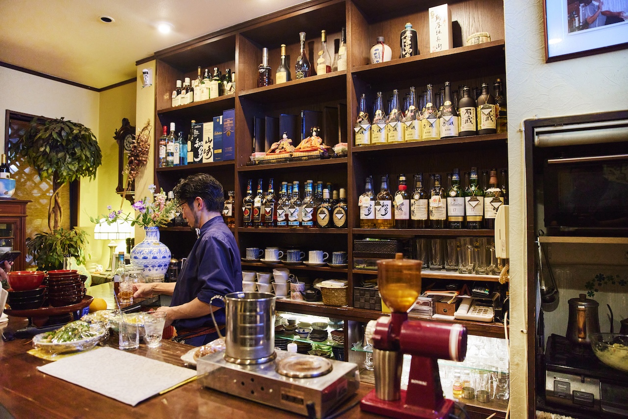 カウンター8席の店内に、整然と並ぶ酒瓶。品よく出番を待つ漆器や、長崎との縁を感じるインテリアたち。その一つひとつが、店主の個性をさりげなくにじませているようだ。