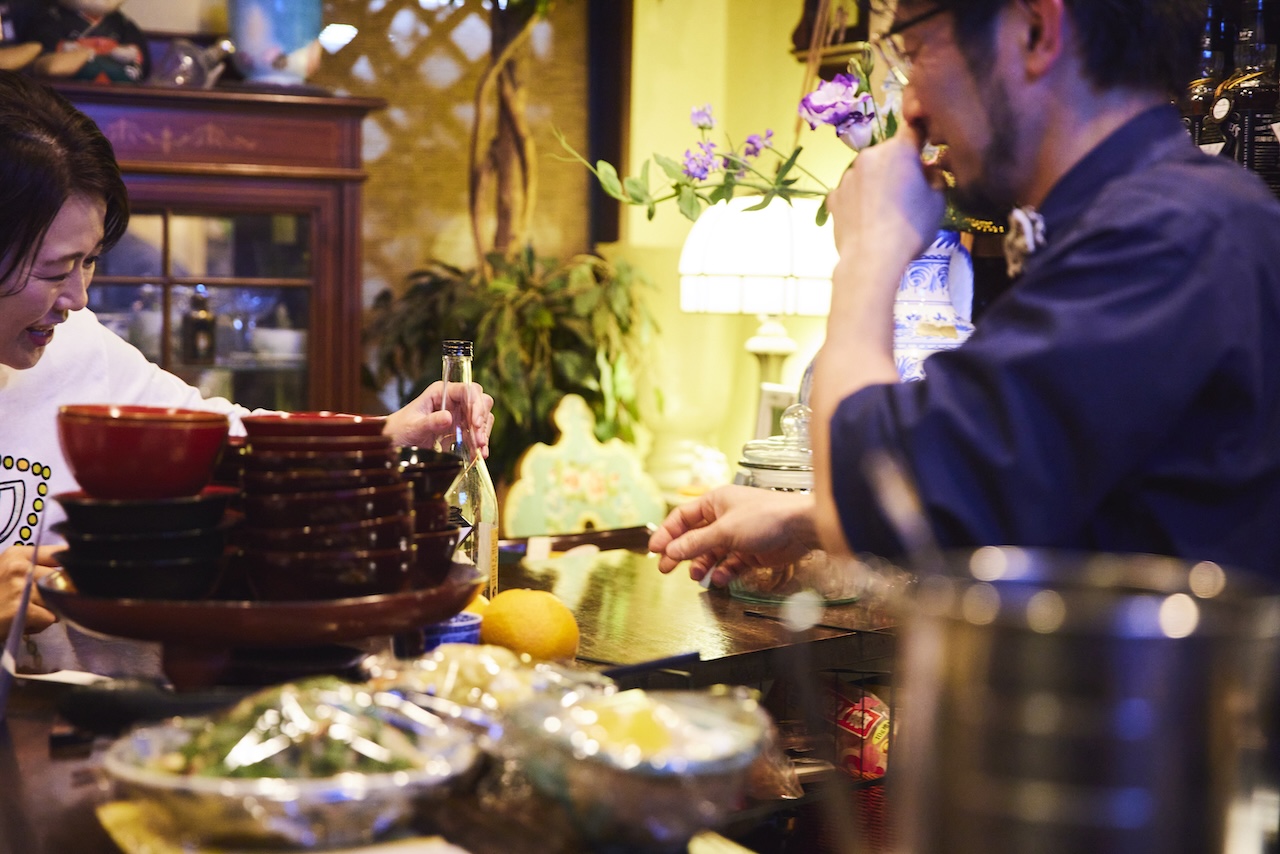 飾られた器を「長崎のものですか?」と聞くと、「母が長崎の出身なんです」と香取さん。不意に始まり、それでいて自然な会話が嬉しい。そして早速、加悦の定番麦焼酎・長崎の「壱岐」で乾杯!